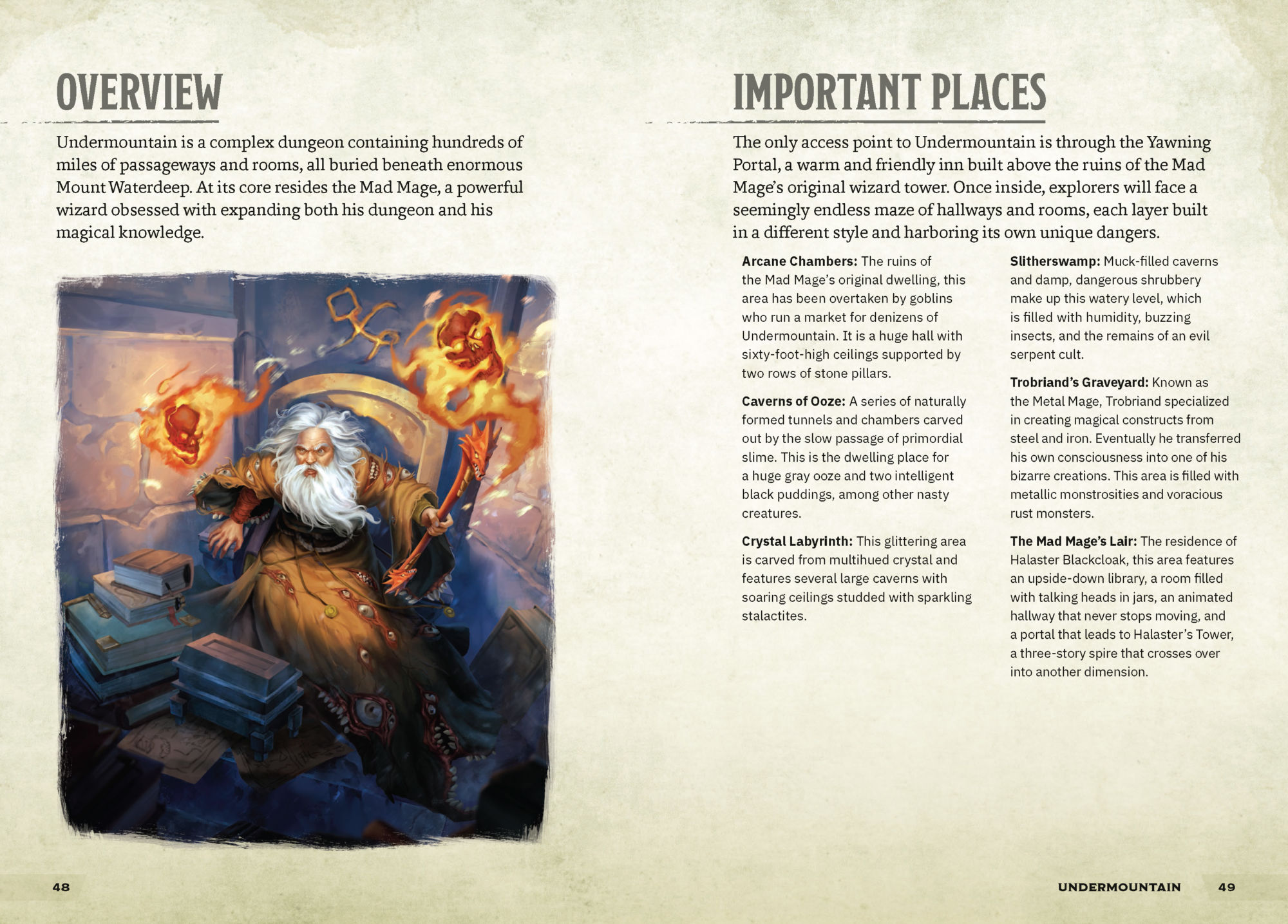 An example shown above is Ravenloft, home to Strahd. They talk about it, give you an overview, highlight some places, put a spotlight on something interesting, and then talk about the main villain. You can see an example of the overview and important places below as they discuss the Mad Mage Halaster Blackcloak and the Undermountain. What they do here is give you enough information for you to learn about the place and all who inhabit it, but leave enough room for your imagination to run wild as to what could be happening in that dungeon. And that's a key element to a guide of this nature that I applaud them for. Filling in enough of the blanks to give you an idea, but leaving room open for you to play with it. Which is something you need down the road if you play the game.