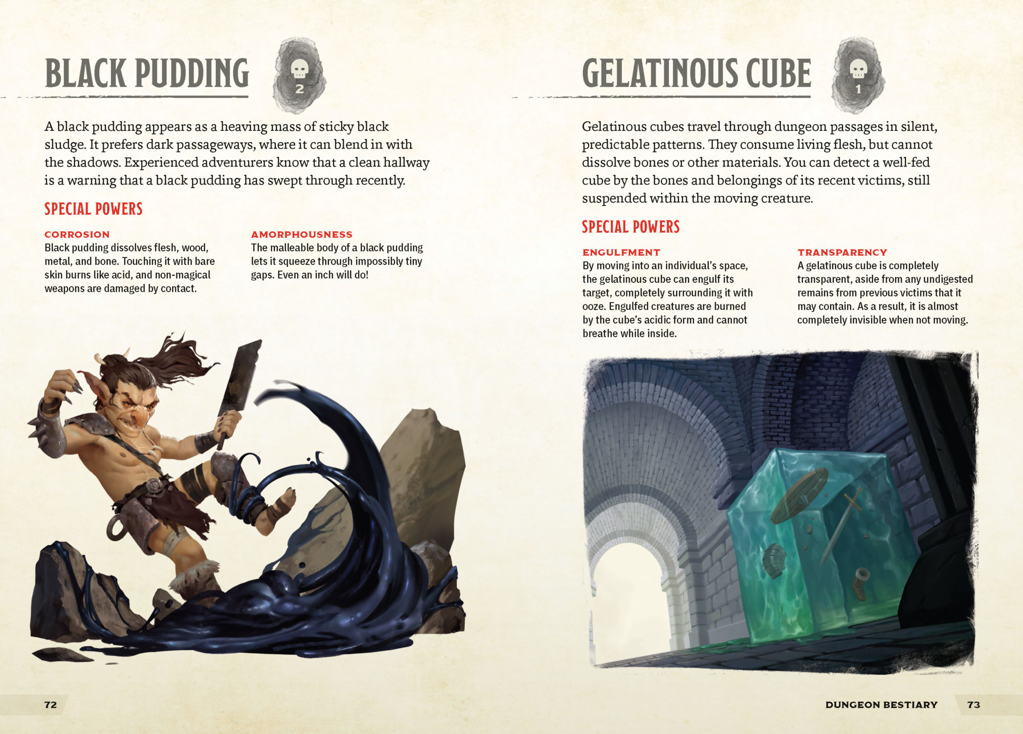 The next major section is the Dungeon Bestiary. This is the short-hand monster manual to learn about all the usual creatures and enemies you'll run into during an average dungeon raid. You can see the pages below cover magical traps like Black Pudding and the ever-scray Gelatinous Cube. Depending on the page you turn to and the creature you find, it will occasionally give you hints of what you should and shouldn't do with certain enemies. Like keeping dry and not to underestimate a creature's size, as it says with the Grung.