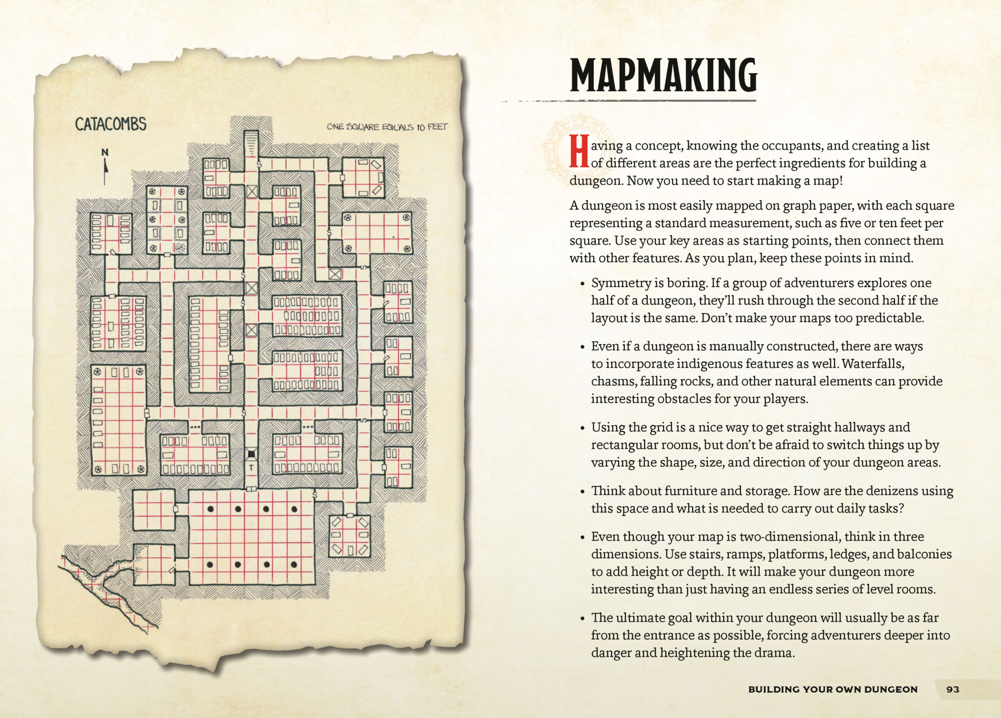 The third part, and probably the most advanced and technical one in all of the books so far is Building Your Own Dungeon. This is about as close to a paint-by-numbers guide of how to create a Dungeons & Dragons map that I've ever seen. Shy of being taught by someone how to make a map on grid paper. It covers mapmaking and the symbols used, figuring out a story and how the dungeon plays a factor in what is happening. Putting in quests and reasons to explore, not to mention your own treasure. But the cool little tidbit they throw on the end is how to make the story your own.