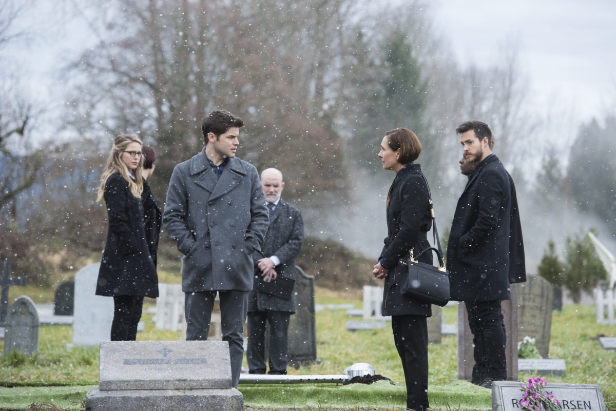 Being that his father was in prison for trying to kill people, including Winn, he's kind of mixed on his feelings here. His friends go with him to his father's funeral and as the coffin is being lowered, he is approached by his estranged mother Mary McGowan (Laurie Metcalf). But before they can say too much, Kara (Melissa Benoist) hears music coming from the coffin and realizes it's going to explode, so she switches to Supergirl and saves them.