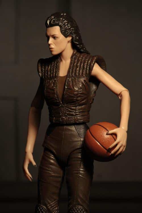 Ellen Ripley Clone 8 stands approximately 7 inches tall, has over 25 points of articulation and features the likeness of actress Sigourney Weaver. She wears the clone's futuristic ensemble and comes with Draco Double Burner and Lacrima 99 Shockrifle accessories, plus interchangeable hands and a basketball.