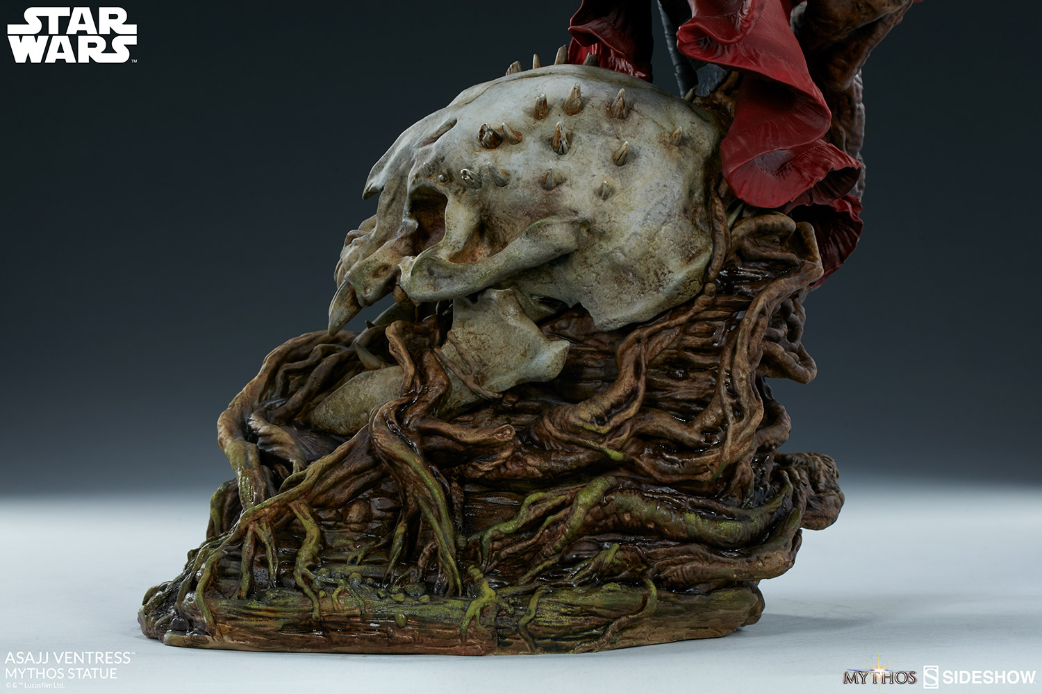 The Asajj Ventress Mythos Statue measures over 22" tall as the lethal Nightsister stands poised on the growths of a Dathomirian swamp base. Beneath her feet lies a Ssurian skull snared in the vines of her home planet's native flora as the Sith assassin wields her dual red lightsabers in preparation for battle.