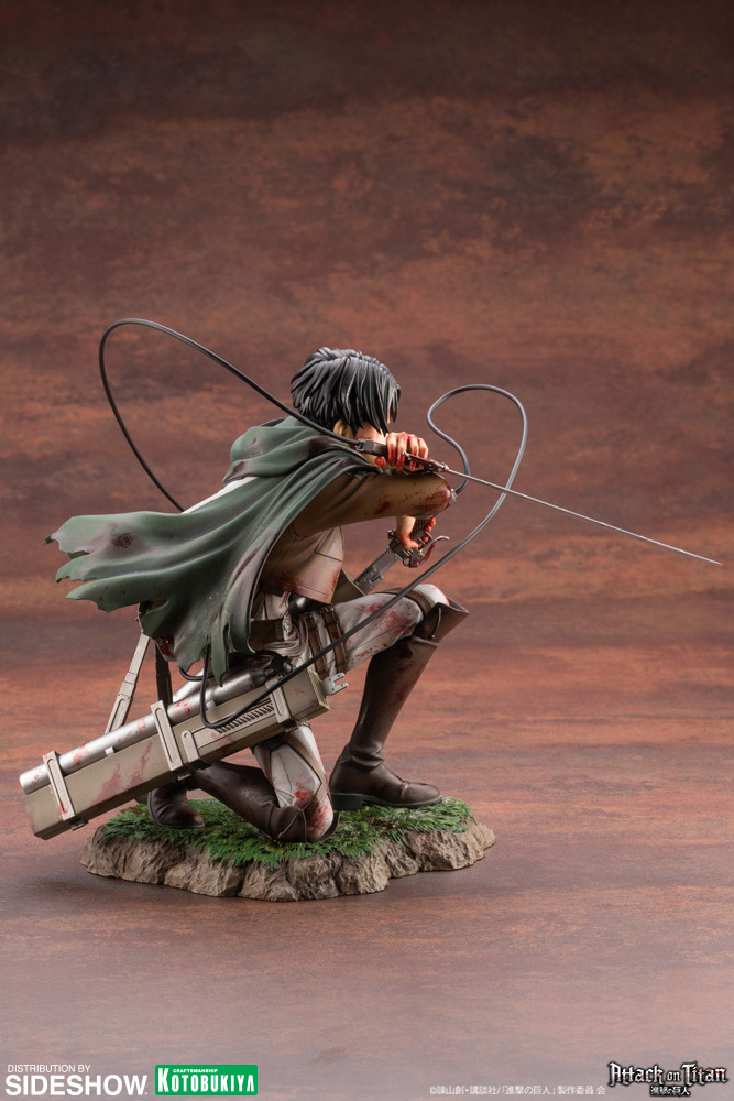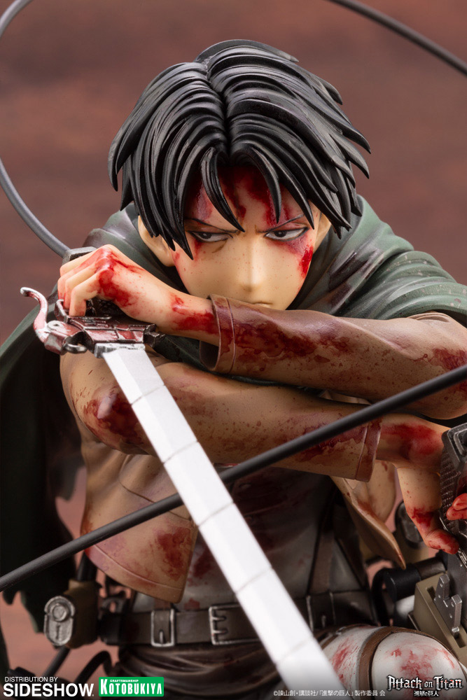 Although wounded in combat, Levi can be seen pointing the blade of his Three Dimensional Maneuver Gear at his enemy in this scale figure rendition. Despite Levi's body being covered in wounds and uniform tattered throughout, his will to survive and fight to the end shows his strong "fortitude". Shin Tanabe who sculpted Kotobukiya's original ARTFX J Levi has returned to craft this new rendition of Levi. Pay close attention This figure has been sculpted to perfection down to every small detail.