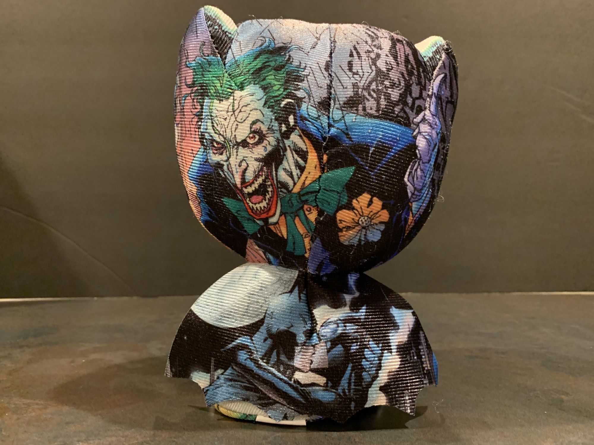 Switching over to the Gamestop Jim Lee one, I have to point out how cool it is that the cape can lift and stay in place. That is a neat little touch. The plush is the exact same body wise, the difference in each is the artwork. Quite a bit of this art is from Hush, but really what other story would you take Jim Lee Batman art from? My favorite piece on this one is the back, with Batman and Catwoman kissing on the cape, and the giant Joker on the cowl. Awesome stuff again.