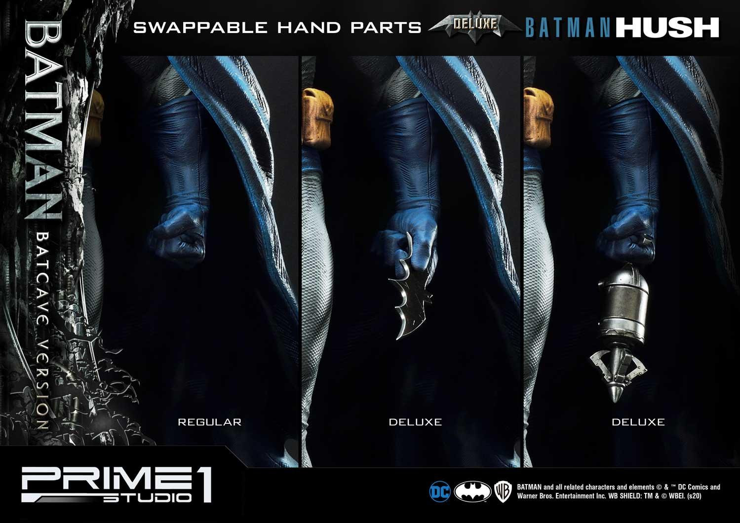 The Batman Batcave Deluxe Version Statue includes in total four alternate Portraits (Normal, Bruce Wayne, Clenched Jaw, Smirk), three Head Stands Bust and three swappable left-hand parts (Grappling Hook, Batarang, Gripped Hand).