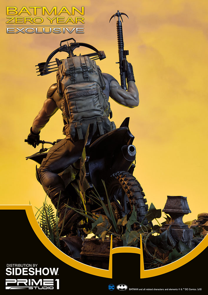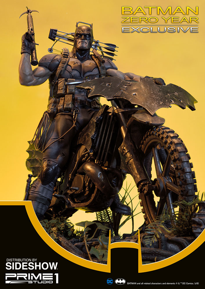This Ultimate Museum Masterline Batman Zero Year statue shows him riding on his bike and comes with an extra interchangeable right-arm holding the Crossbow. This Exclusive version of Batman Zero Year includes an additional right-hand holding a Grapple Hook.