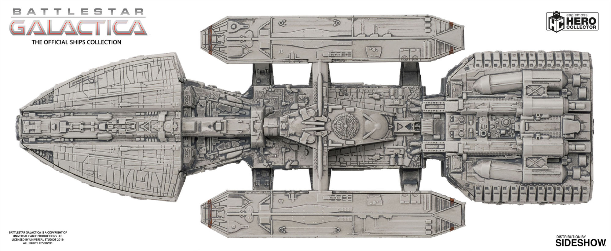 It captures the ship's sleek but deadly angular design, and small details like fuel lines, engine burn, and its modern silver paintwork. Eaglemoss has worked closely with members of the Galactica VFX team to ensure that the model is as accurate as possible. The ship comes complete with a 16-page collectors magazine providing an in-depth profile of the ship, exclusive behind the scenes articles, original design sketches, and an interview with the series developer, Ronald D. Moore.