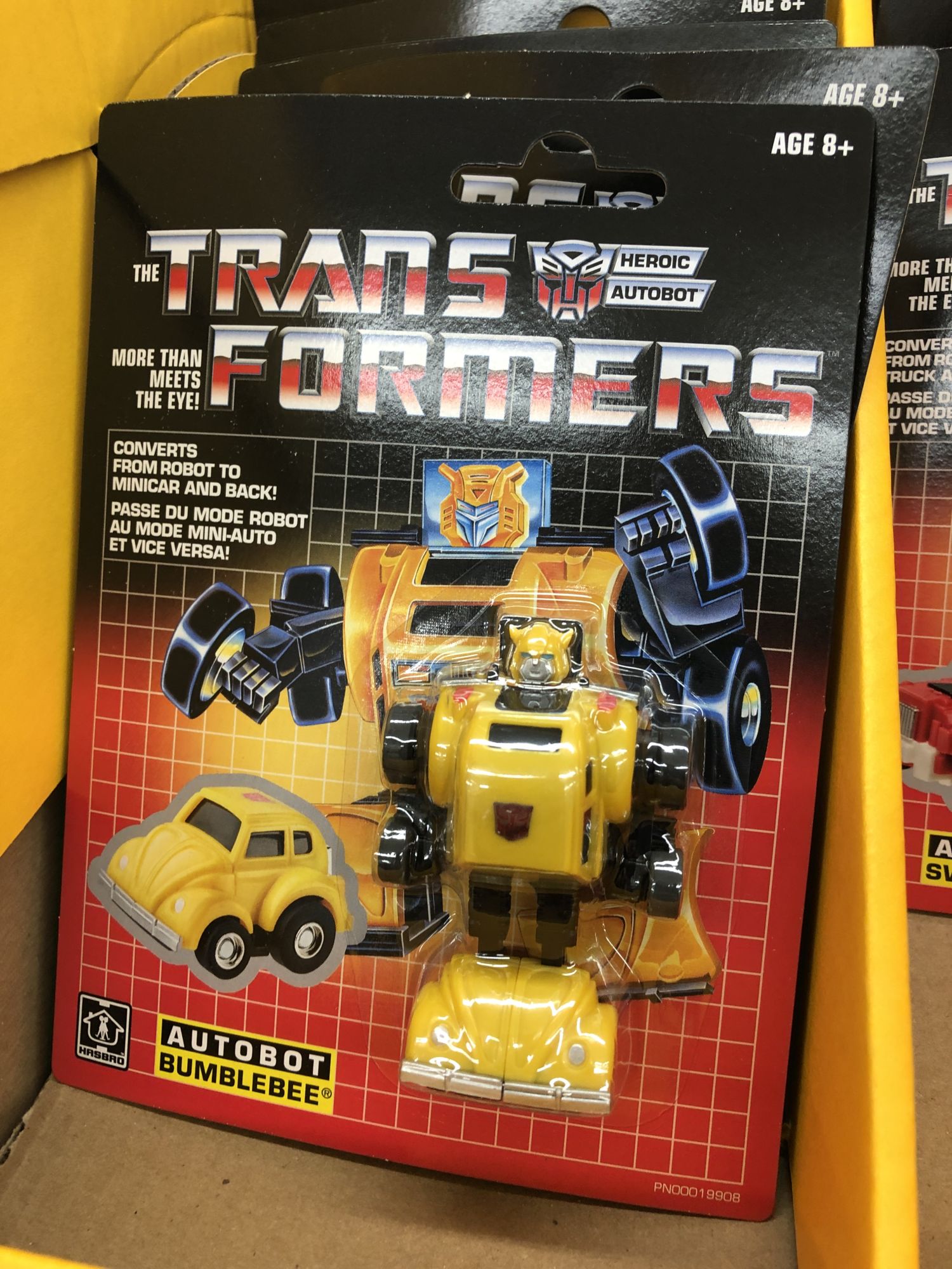 Walmarts have tons of new Transformers toys right now, including four vintage carded mini-bots. Bumblebee, Swerve, Tailgate, and Outback make up the wave, and they are spectacular. Look for the display in different areas of the store: I found this one in the food aisles.