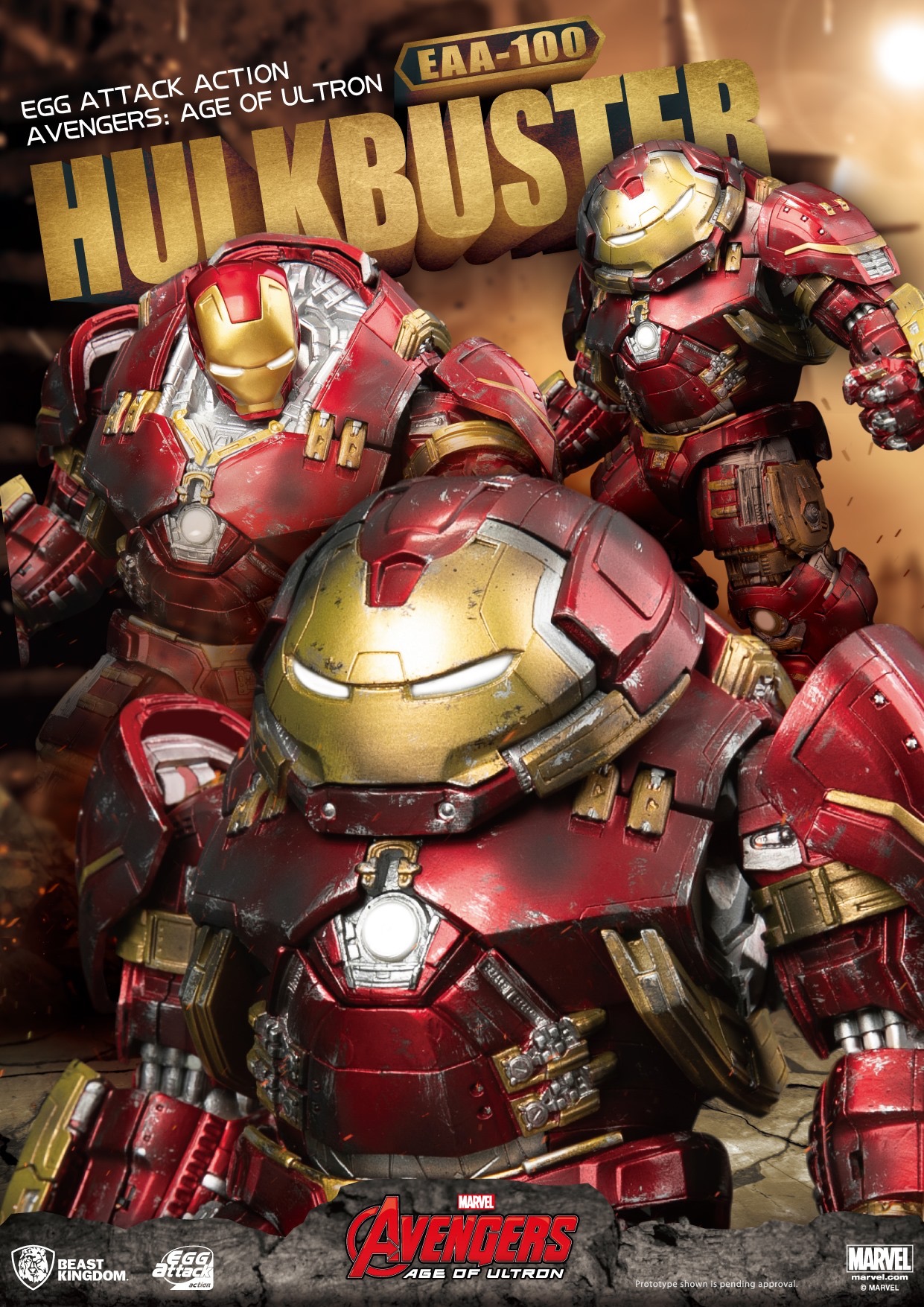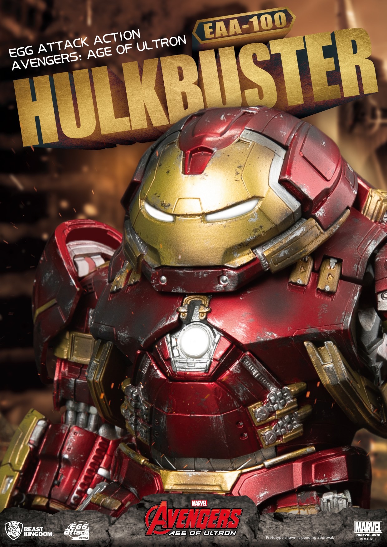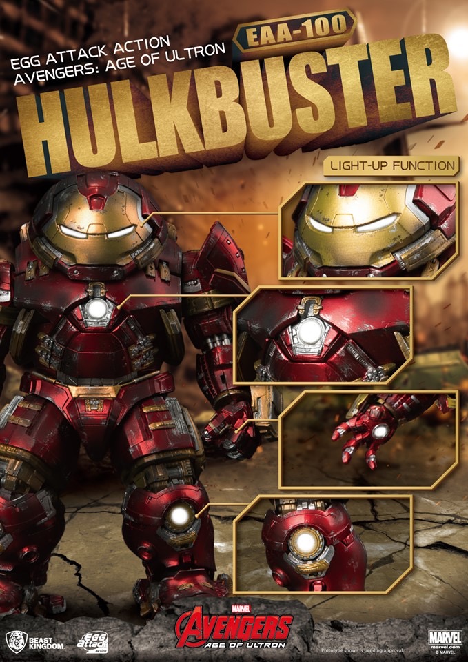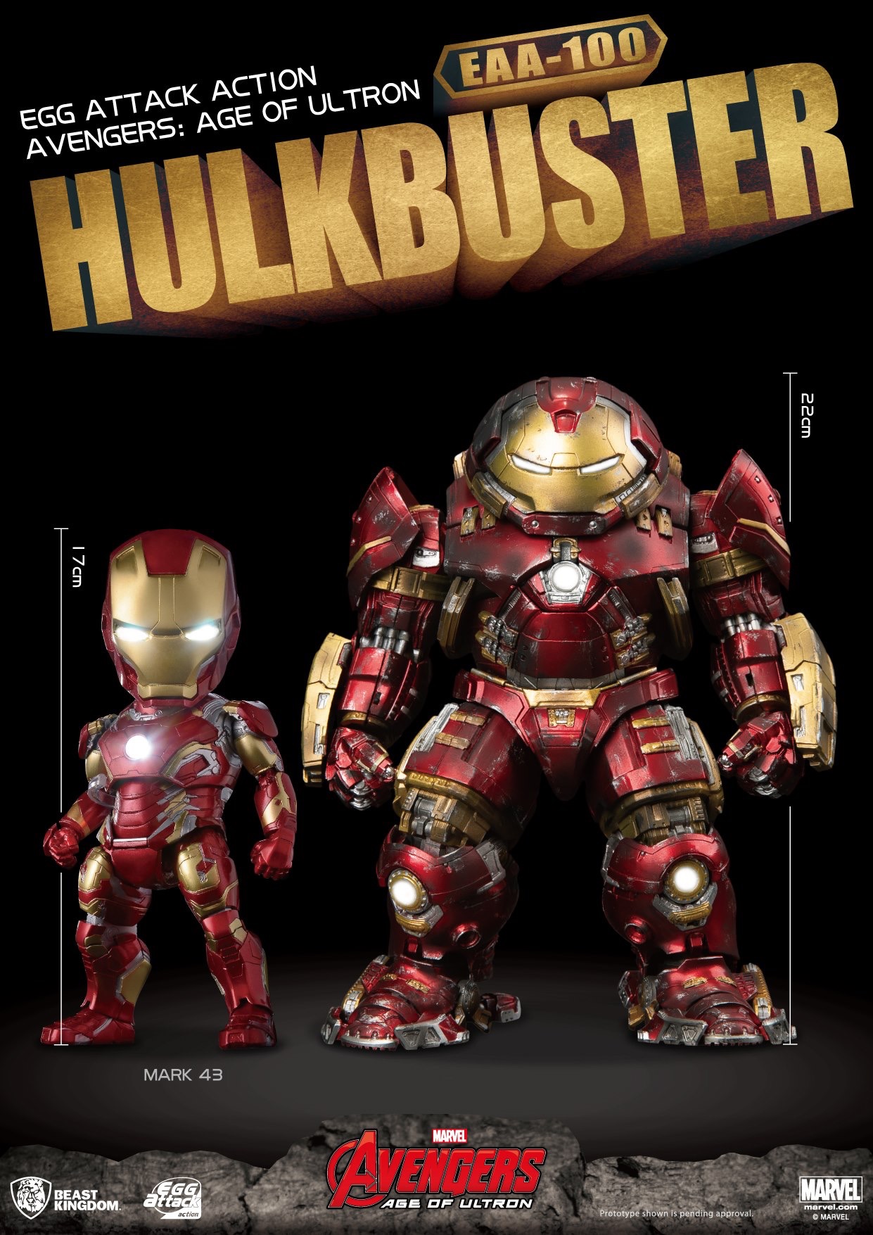 Hulkbuster versus the Hulk was one of the greatest things in Avengers: Age of Ultron. The true technological genius of Tony Stark against the raw power of Bruce Banner's rage. The Battle was legendary and the Hulkbuster became solidified in new fame. That fame comes back with Beast Kingdom in their Egg Action Attack series of figures. He stands 8" tall and has 20 points of articulation. Hulkbuster does come with an extra head to show off Iron Man inside the suit. The figure is also loaded out with LEDs to give you that perfect glow. Extra interchangable hands, blaster effect and armor pieces are all included with him too. With the recent announcement of the Hall of Armor set, collectors can add one more suit to the line-up!
