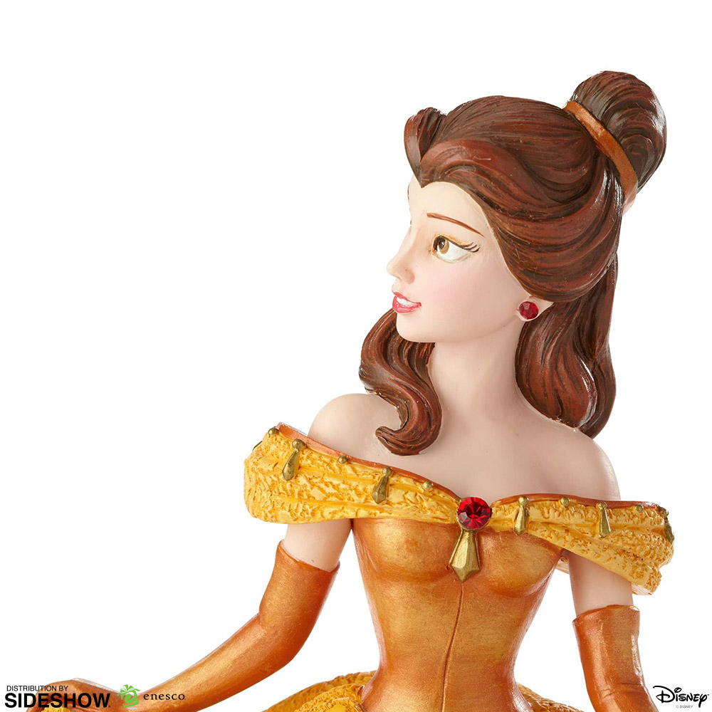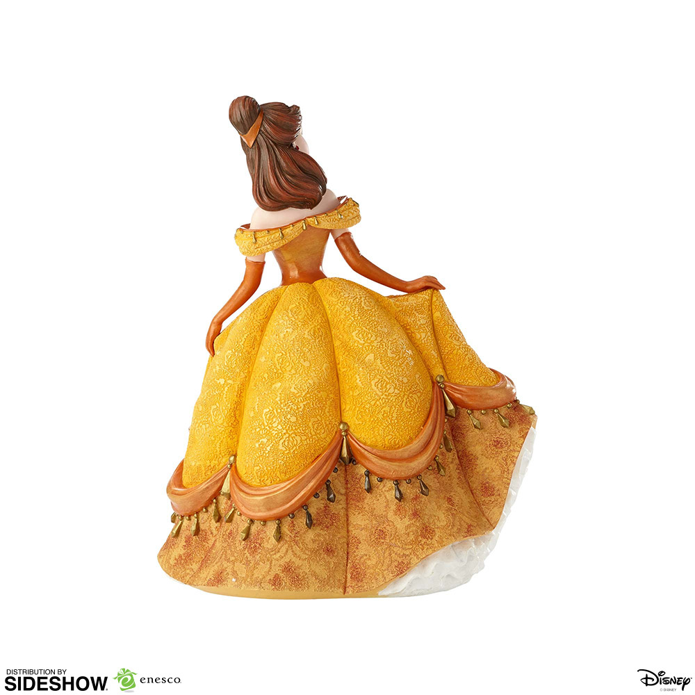 In this intricate detailed stone resin figurine, Belle's signature golden ballgown is elevated to beautiful new heights with the addition of a subtle rose-inspired print that adds luxurious depth, sculpted tassels, and scarlet gems.