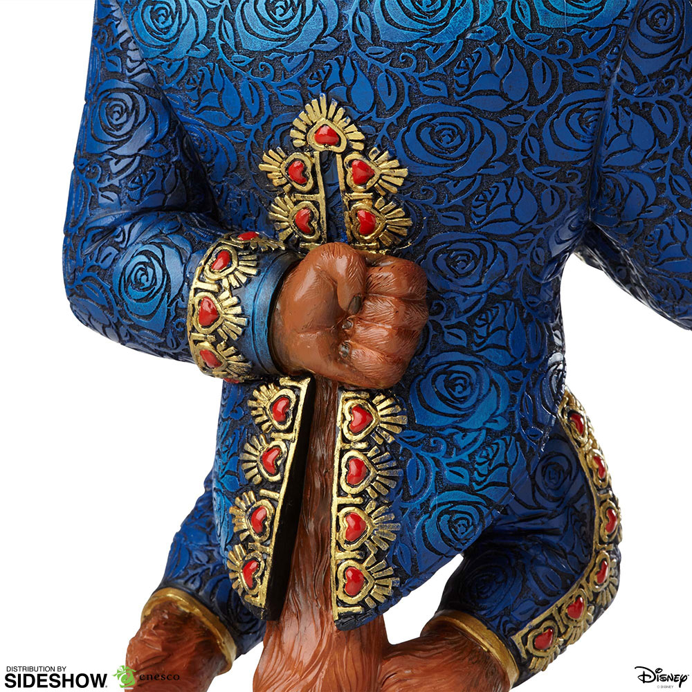 The Couture de Force collection by Disney Showcase infuses a bit of fantasy into the magical world of fashion. Our team of highly skilled artisans flex their sartorial muscles, taking the signature ensembles of Disney's most beloved characters and elevating them with accessories, embellishments, and a healthy dose of imagination. The Beast from Disney's "Beauty and the Beast" looks quite princely in this haute couture take on his classic ballroom attire. Meticulously sculpted from stone resin and painted by hand, his tail suit looks to be cut from a beautiful rose brocade with embroidered waistcoat, sacred heart trim, and silk cravat. A faux ruby detail lends a regal finish.