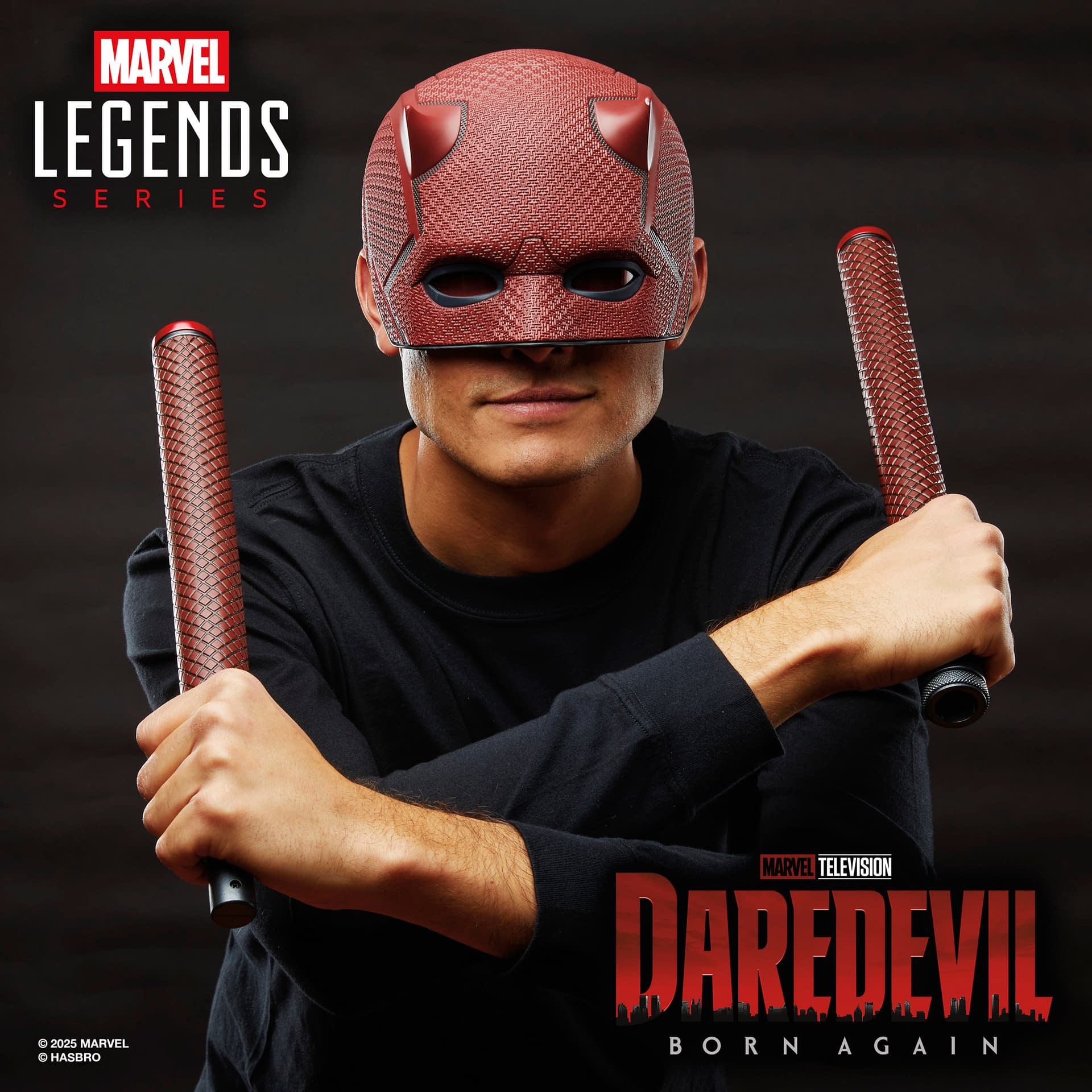 "(HASBRO | Ages 14 and Up | Approx. Retail Price: $139.99 | Pre-Order on September 16 at 1PM ET on Hasbro Pulse and participating retailers; available Fall 2025). Hasbro Marvel Legends proudly presents this 1:1 scale reproduction of Daredevil's iconic mask from the Daredevil: Born Again series! This roleplay mask with premium design and deco features the character's signature red horns and eyes. The set also comes with a detachable two-piece Billy Club to imagine Daredevil in action. This Marvel roleplay set includes a stand and is great for displaying in fans' collections. Bring series-inspired scenes to life with Marvel Legends action figures, roleplay gear, and collectibles (each sold separately, subject to availability)."