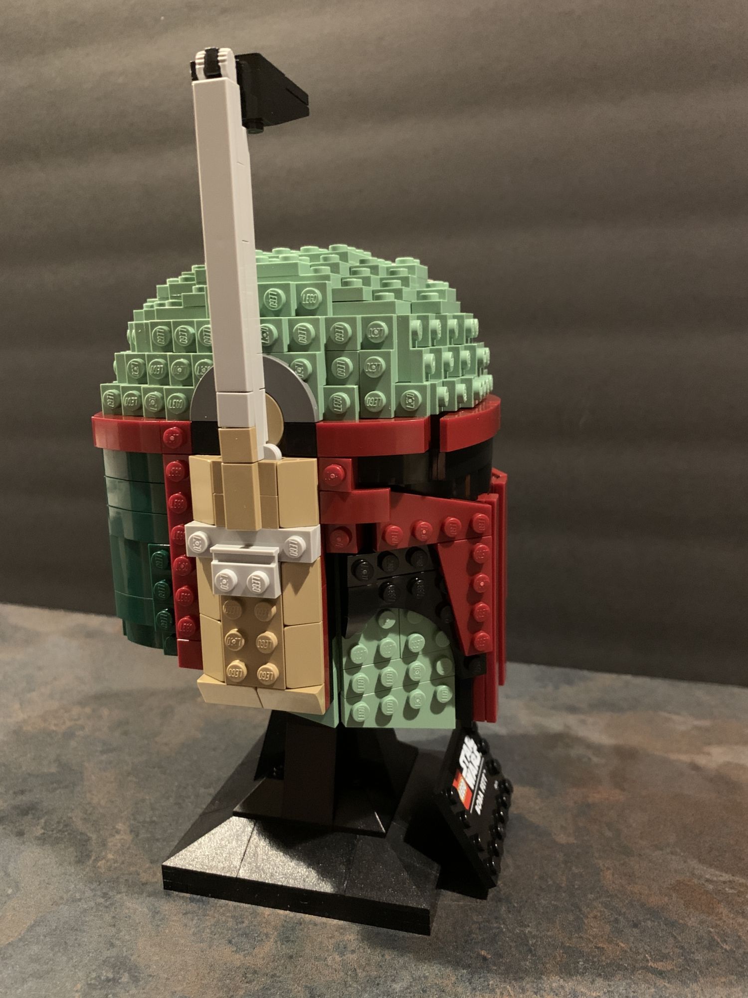 Once completed, you really get a good sense of the quality and thought put into these. They are striving for screen accuracy, and I think they nailed it. Every little detail is there, right down to the scoff at the top of the helmet. Boba Fett's visor on the front is sleek and shiny, and the fact that the rangefinder on the side is moveable is a great touch. I was a little afraid that the helmet would seem jagged and out of sorts because of the bricks, but that is not the case. I especially love the nameplate included for the base, it just adds that one extra touch that it may be lacking without.