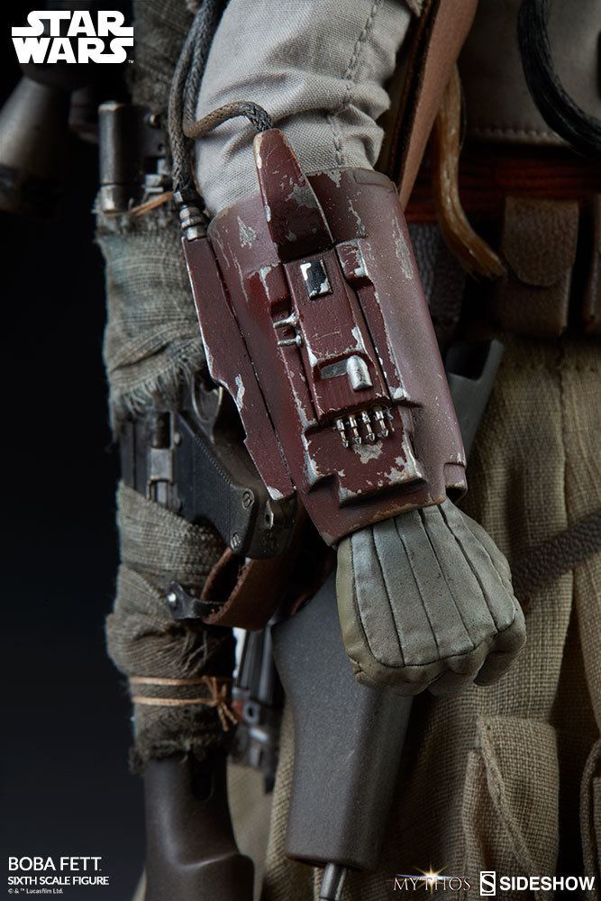 The Boba Fett Sixth Scale Figure captures the galactic legend of this feared bounty hunter in a never-before-seen way. Boba Fett features uniquely sculpted Mandalorian armor, including his iconic helmet with an articulating rangefinder, a flight suit and vest with body plate armor, knee pads, and weaponized wrist gauntlets. Each aspect of the newly crafted armor is detailed with distinctive Mythos weathering effects, telling the story of many hard-fought battles to capture some of the galaxy's most elusive bounty. Boba Fett's unique costume also includes a worn fabric poncho, a kama skirt with utility pouches, ankle spats, and several belts with side and waist pouches.