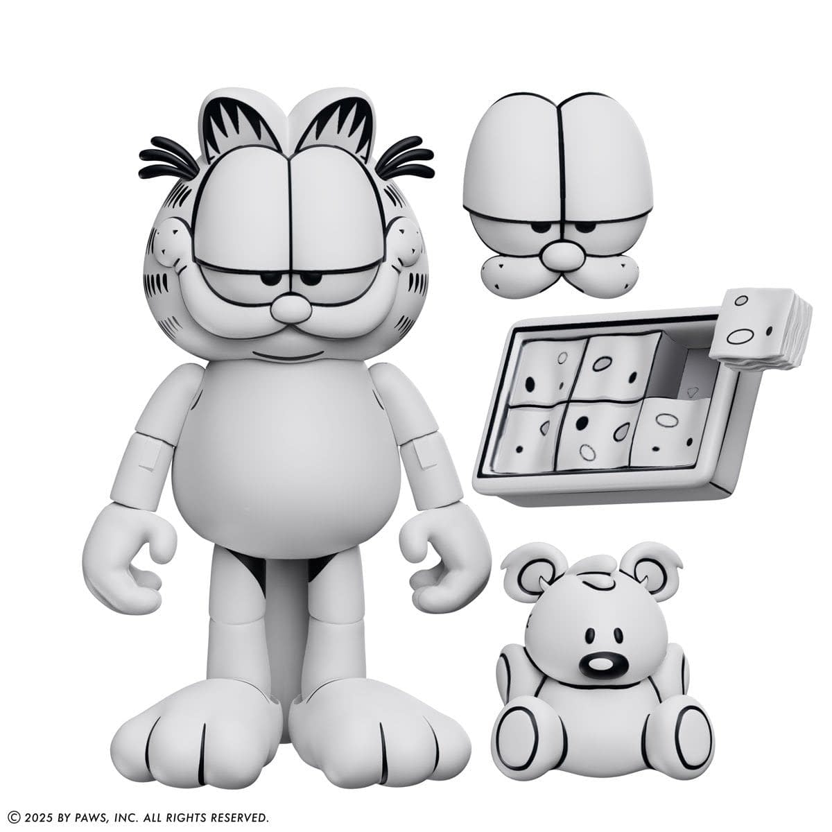 "This fantastic feline includes an interchangeable expression and a lasagna tray with a removable piece. As an extra treat, Garfield's beloved teddy bear, Pooky, is included! Exciting newspaper comic-inspired blister card packaging will make this the centerpiece of your Garfield collection. Limited to 2,000 pieces, don't miss your chance to catch this monochromatic cat!"