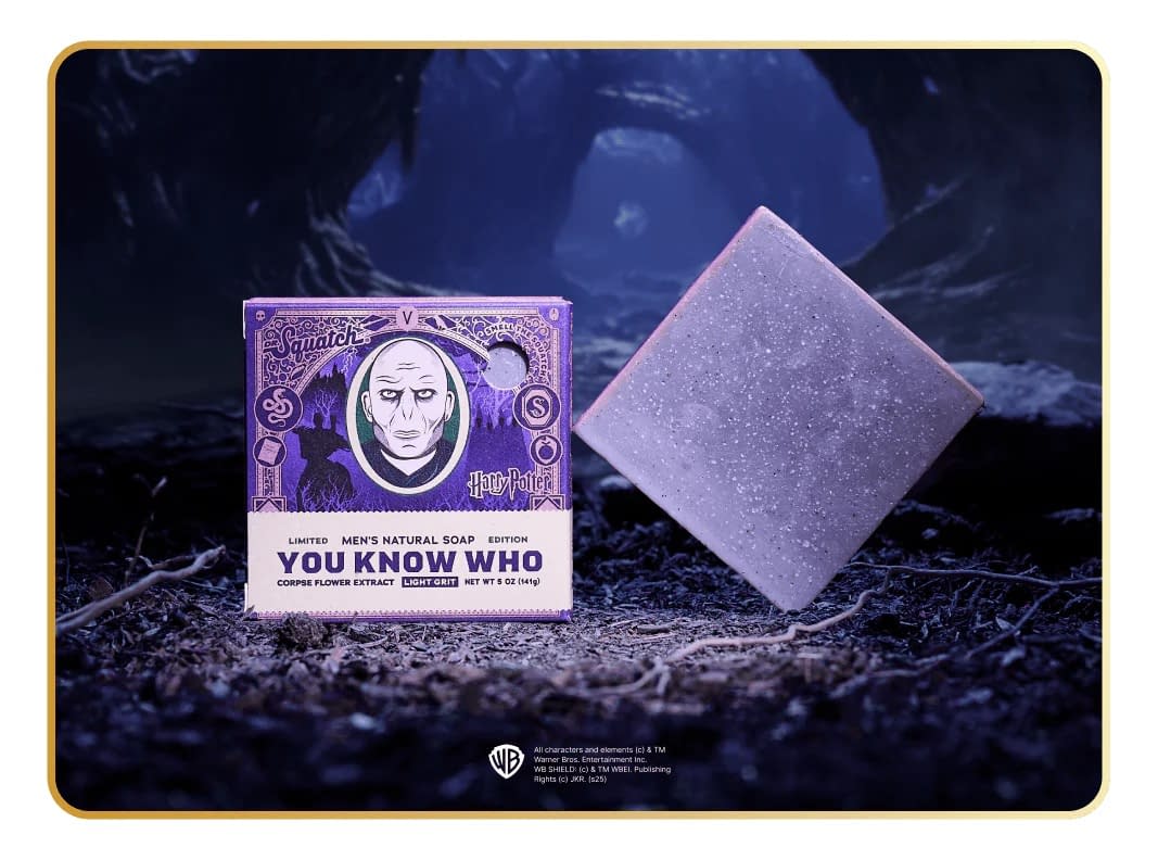 Dr. Squatch is stepping into the Wizarding World of Harry Potter as they capture saga's greatest rivalry with a brand new drop. These magically crafted briccs are designed to embody light and darkness with the Harry Potter "The Chosen One & You Know Who" Collection. The Chosen One channels the courage of Harry Potter with a medium-grit blend scented with bright lemon zest, grounded by warm birchwood, and accented with vanilla. To counter such a magical and powerful spell, Dr. Squatch debuts its counterpart, You Know Who, a light-grit bar steeped in forbidden allure.