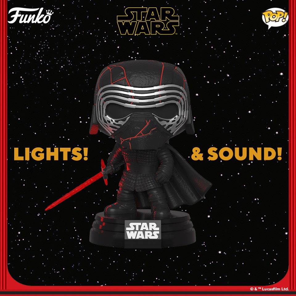 Bring home an electronic Pop! Kylo Ren, hematite chrome Pop! Knight of Ren (blaster), hematite chrome Pop! Knight of Ren (club), hematite chrome Pop! Knight of Ren (scythe), hematite chrome Pop! Knight of Ren (cannon), hematite chrome Pop! Knight of Ren (blade) and hematite chrome Pop! Knight of Ren (axe), a 10" glow in the dark Pop! Kylo Ren, Pop! Dark Rey, a metallic Pop! C-3PO™ with red eyes.
