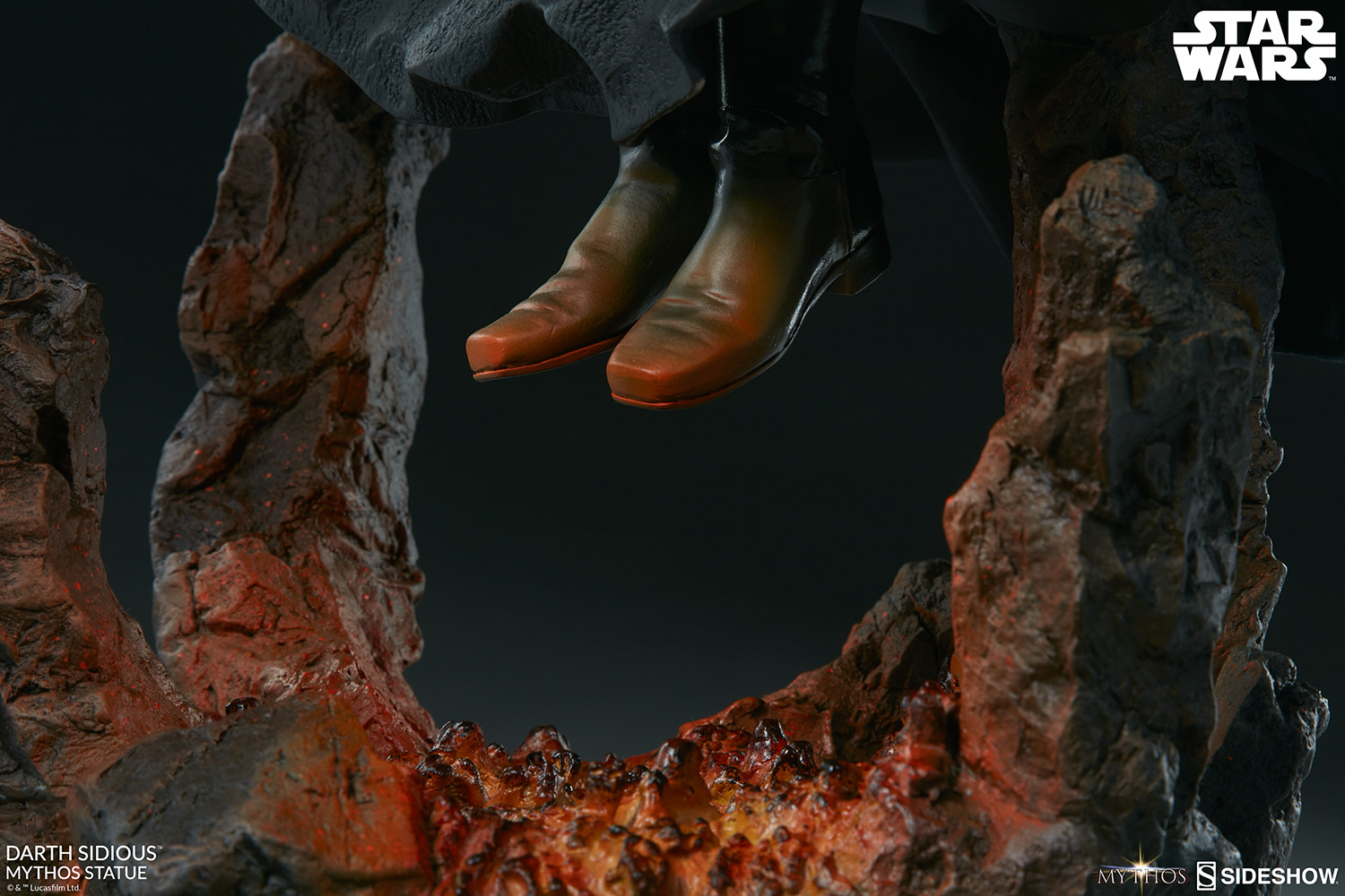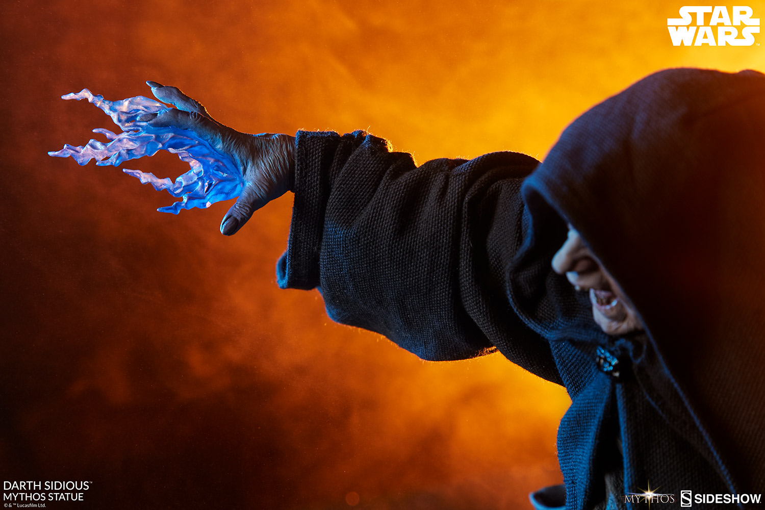 The Darth Sidious Mythos Statue measures 21" tall, as the vengeful Sith levitates over the roiling lava of the volcano planet Mustafar. Drawing power from the dark side of the Force, Sidious shoots a blue bolt of lightning from his gnarled fingertips in a fearsome display of rage.