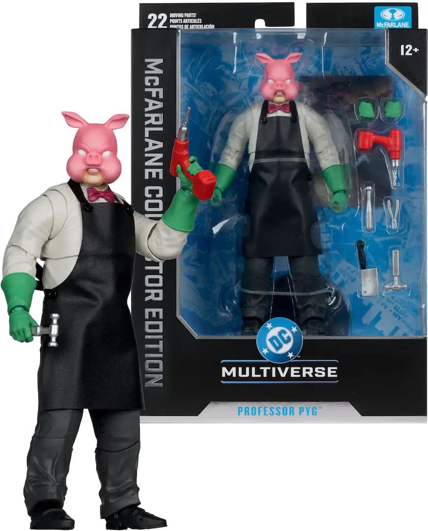 Professor Pyg wears a grotesque pig mask and often speaks in theater nursery-rhyme-style dialogue, showing the further loss of his mental state. Professor Pyg is now ready to carve up your Batman collection with a new figure that features the villain in a soft good apron with a variety of killer tools. This figure will surely stand out as one of the more ruthless villains in your DC Multiverse collection, and he is already up for purchase right now for $34.99.