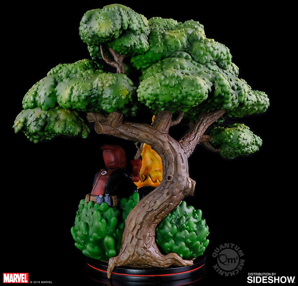 Our Deadpool x Ghost Rider Q-Master diorama showcases Deadpool's wicked sense of humor as he gleefully bursts through the wall between comic franchises all for the sake of a tasty sight gag. The scene beautifully captures the finest details of both characters down to the firelight from Ghost Rider faintly reflecting off the foliage around him.