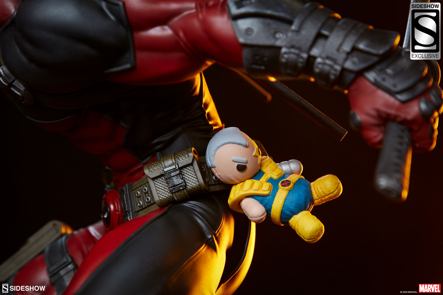 "The Exclusive Edition of the Deadpool Premium Format™ Figure includes a sculpted Cable Doll that can be attached to Wade's belt so he can carry his best friend everywhere he goes. Pair Deadpool with the Exclusive Edition of Sideshow's Cable Premium Format™ Figure to create a display (and a legendary friendship) that crosses the multiverse. Without the pesky fourth wall in your way, you have just the right amount of space in your collection to bring home the Deadpool Premium Format™ Figure today! (And if you're craving chimichangas, maybe he'll let you borrow his utensils.)"