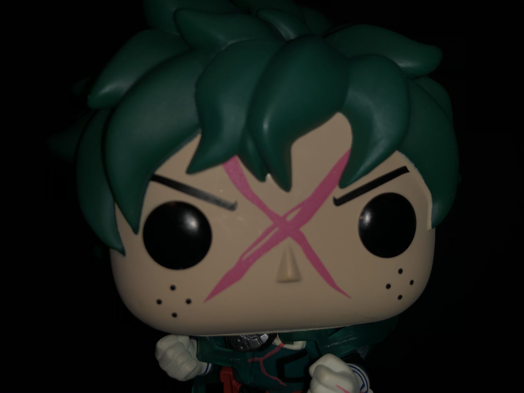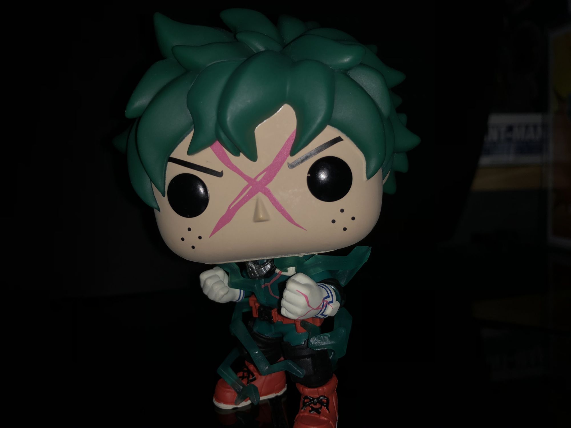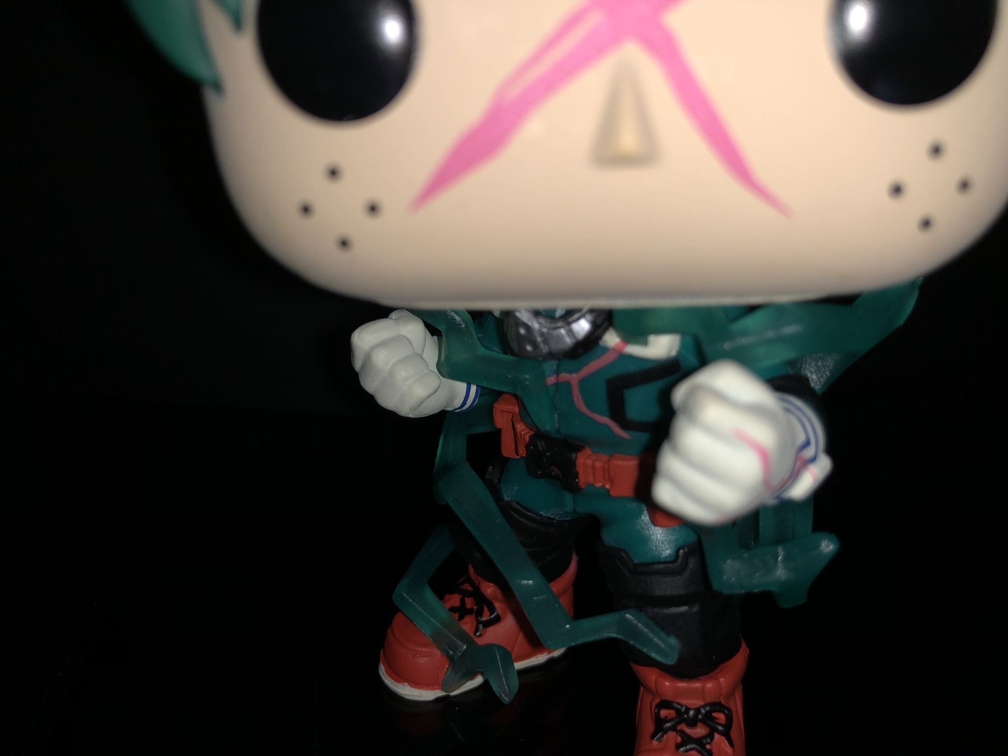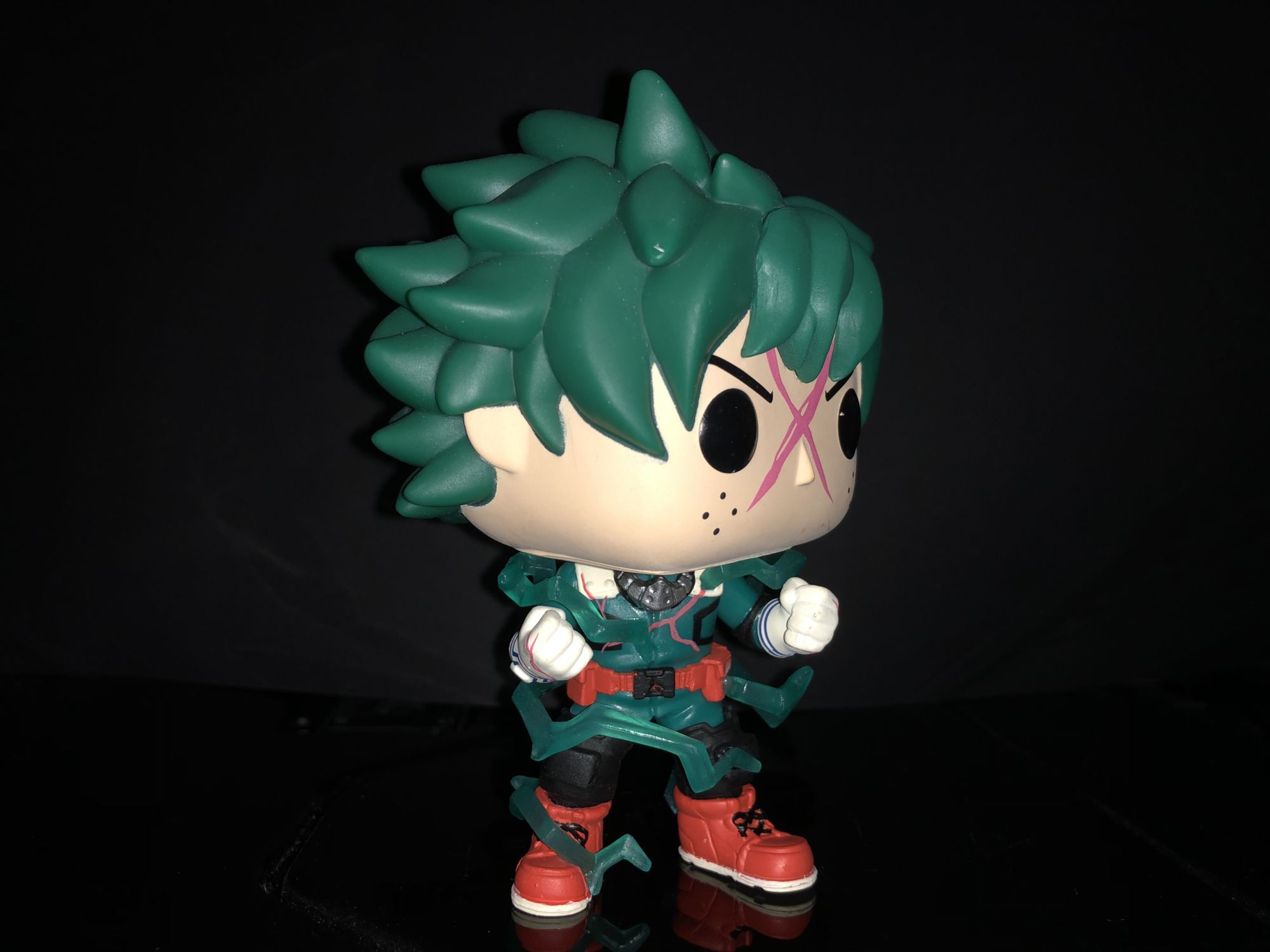 First up is the Entertainment Earth exclusive Deku Funko Pop! He is more detailed than ever and even shows off his newly updated costume. We could see this in Season 3 when he focused more on his legs as units of All for One. This Deku is unique from more than just a costume he does glow in the dark!. The giant red X on his face does show the power surrounding along with full-body electricity around his body. We have seen this before in a lot of the Dragon Ball Z Funko Pop's and I enjoy it on this figure. Deku glow features aren't represented here in these photos but I can assure you it is awesome. The detail on this character is definitely given off amazing energy and is perfect for any My Hero Academia.
