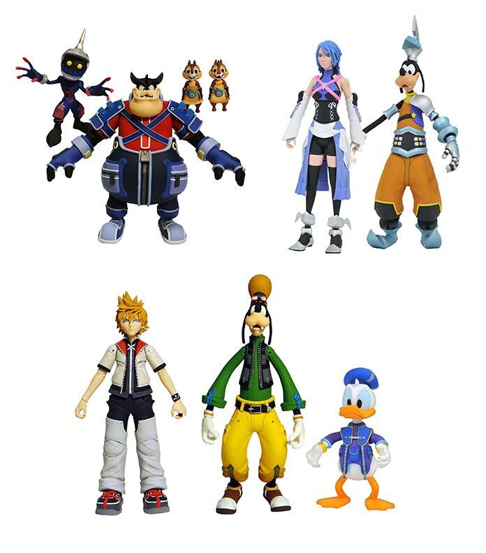 A Diamond Select Toys Release! It's time to return to the Kingdom! The second series of Kingdom Hearts Select Action Figures brings fans new, beloved Disney characters as well as characters created for the Kingdom Hearts series of games! Three sets of figures arrive in Series 2, including Roxas with Donald Duck and Goofy, Pete with Chip and Dale and a Soldier, and Aqua with Goofy in his Birth By Sleep Outfit! Action figures range from 2 to 7 inches tall and feature multiple points of articulation. Each set comes packaged in the display-ready Select action figure packaging with side-panel artwork. Sculpted by Oluf W. Hartvigsen!