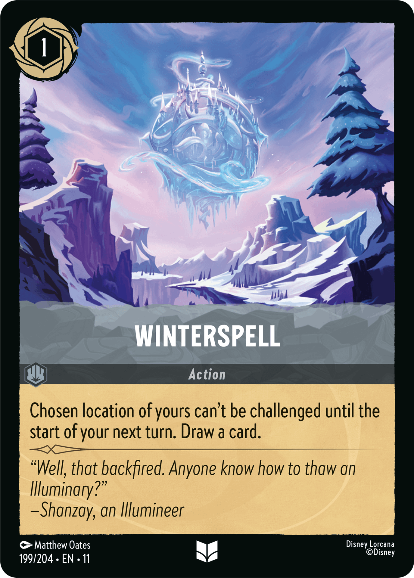 "Everyone in the realm of Lorcana is hunkering down for a wonderful Winterspell. The next set for the Disney Lorcana Trading Card Game (TCG) focuses on a flurry of winter fun activity following the mystery and intrigue of Whispers in the Well. A frozen blast cast by an Elsa glimmer goes awry creating a flurry of snow and ice unlike anything the realm has seen before, including fan-favorite characters from Disney's Pocahontas, Angel from Lilo & Stitch: The Series, and Darkwing Duck from Darkwing Duck."
