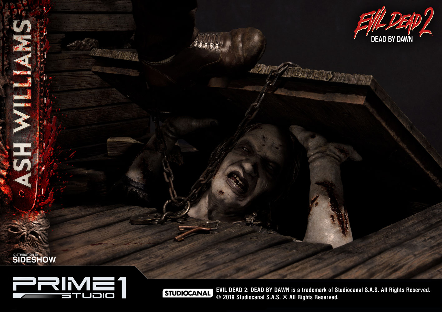 Evil Dead brought to life a new style of movie with a combination of comedy and horror. We really don't get all of the comedy till Evil Dead 2: Dead by Dawn and the introduction to the chainsaw hand. Of course, you can't have this franchise without its lead, Ash Williams, portrayed by Bruce Campbell. Prime 1 Studio has teamed up with Sideshow Collectibles to bring fans an amazing horror filled statue. This 1:3 scale statue really shows the bloody horror throughout this statue. The whole piece is quite dynamic from Ash's look to Henrietta coming up from the cellar, you really get all of the Evil Dead effects in one place. With Sideshow Collectibles you can get an extra alternative head portrait fro Ash Williams and you can complain about statue customization.