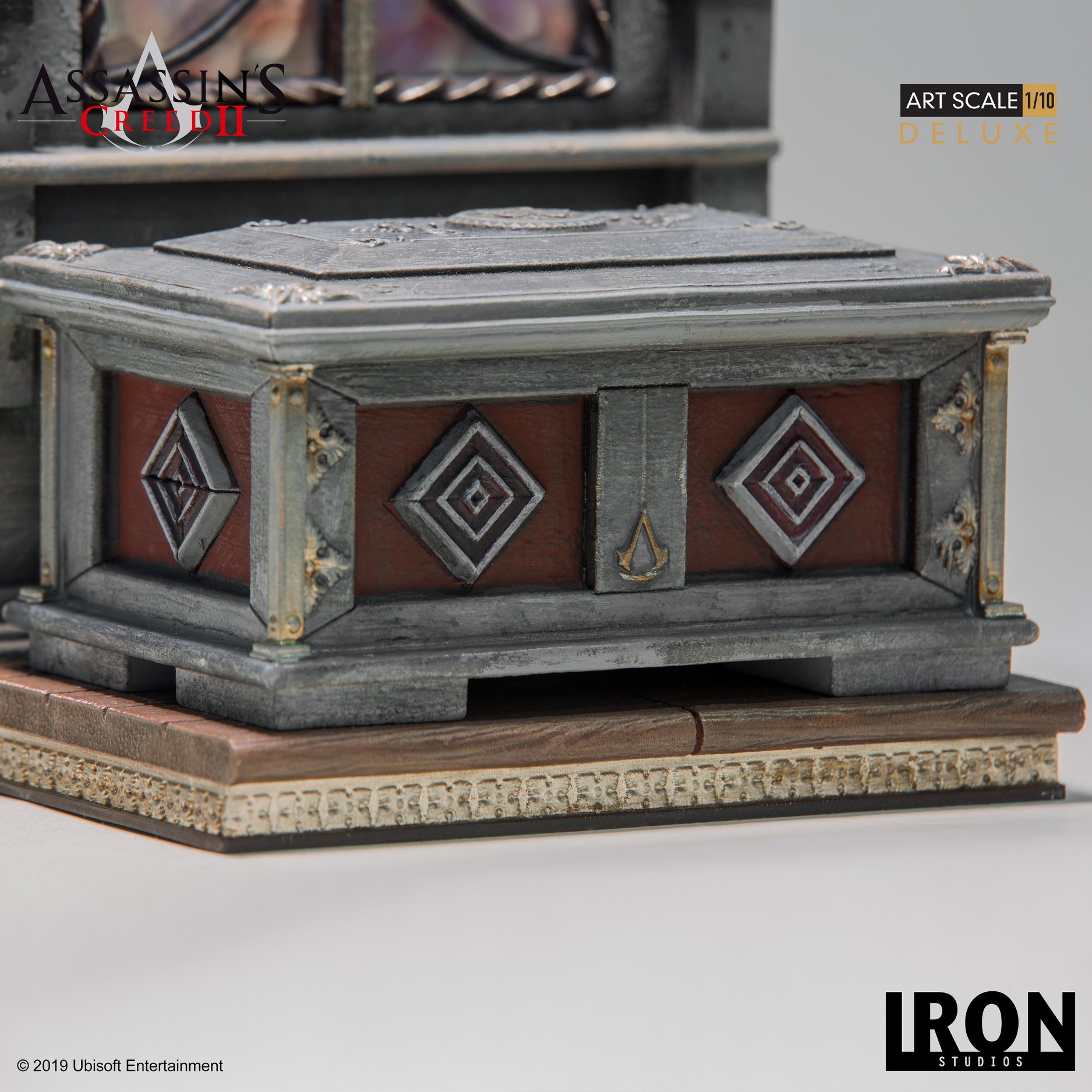 Ezio and his story for Assassin's Creed II, Assassin's Creed: Brotherhood and Assassin's Creed: Revelations was emotional, heroic and adventurous. The amount of time that I put into those games I easily a wonder. Iron Studios has announced two new statues of the iconic hero. Both stands have Ezio, he is standing with arms wide with both hidden blades extended. The statue doesn't have fabric on it but from staring at it and the amount of detail in it you could almost forget. Ezio's outfit is detailed to the eye from the video game series. The deluxe version comes with a remarkable Italian Renaissance designed base. With the Assassin on a windows ledge, a stained backdrop and one of the chests from the game that hold secrets. I prefer the deluxe version over the standard one. The added base shows off a completely more dynamic and depth to this Iron Studios Ezio Statue. This statue is beautifully crafter and shows off the character to a tee. Iron Studio statues are already art on its own.