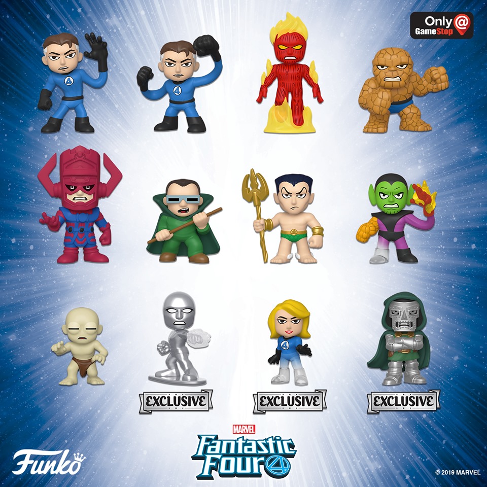 A Mystery Mini series available exclusively at Target includes Mister Fantastic, a stretched version of Mister Fantastic, Doctor Doom, Silver Surfer, Galactus, Mole Man, Namor, Super-Skrull, Terrax, Thing, Invisible Woman (in suit), and Human Torch.