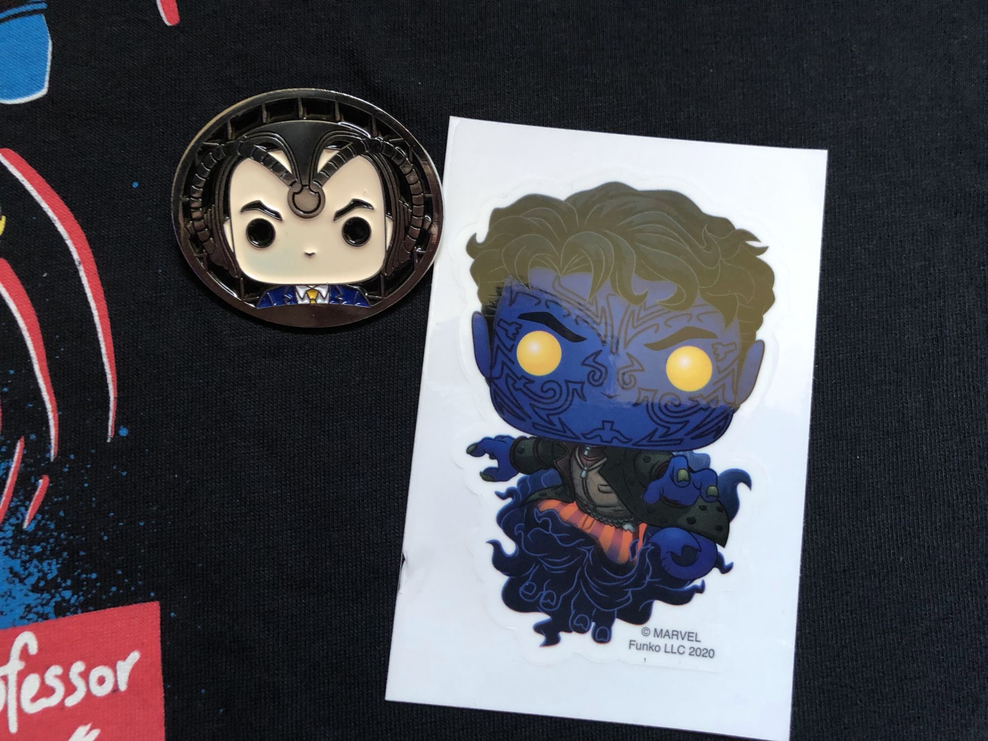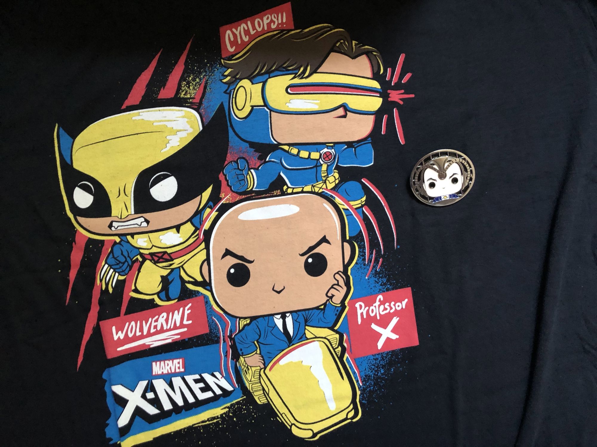 Right off the bat, the box shows off that metallic X-Men logo from the film with the door that lets to Cerebro. Opening up the box, we are greeted without the first item, a Funko Pop tee. The Pop Tee is more for the comic book fans but the colors and the design are popping! The 90s X-Men costume was classic so this tee is quite well and I love having more nerdy Pop shirts in my wardrobe. Our next two items are usually jazz with a Pop Pin featuring Professor X and a Nightcrawler sticker. The sticker is quite similar to the SDCC Nightcrawler Pop that is sold out pretty much immediately. The three non-Funko Pop items are always fun to get the Pop tees are always fun to see and great to wear.