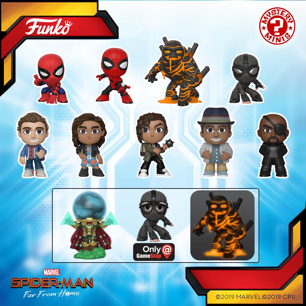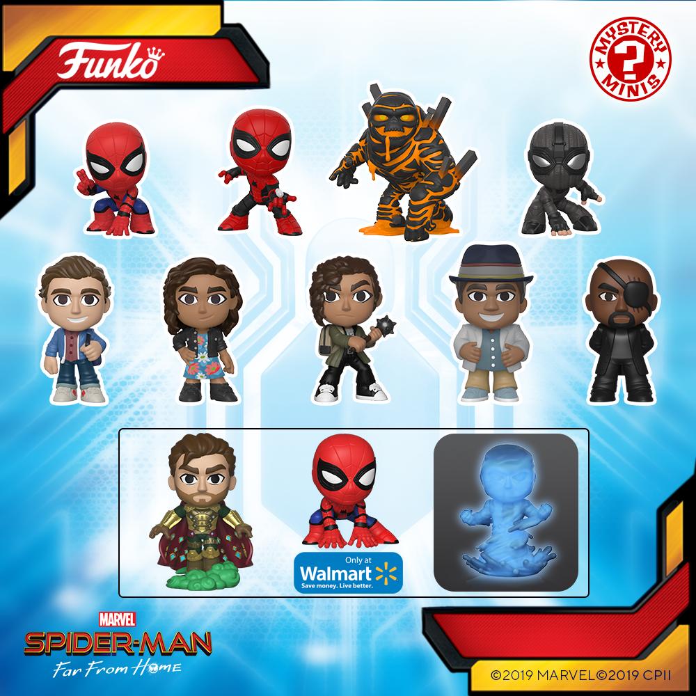 Three Pop Pens to start, of Spidey, Spidey in I think they are calling it a stealth suit, and Mysterio. Then, the Mystery Minis. Gamestop will have exclusives of Mysterio, Spidey and Molten Man, while Walmart will have exclusives for Mysterio, Spidey, and Hydro Man.