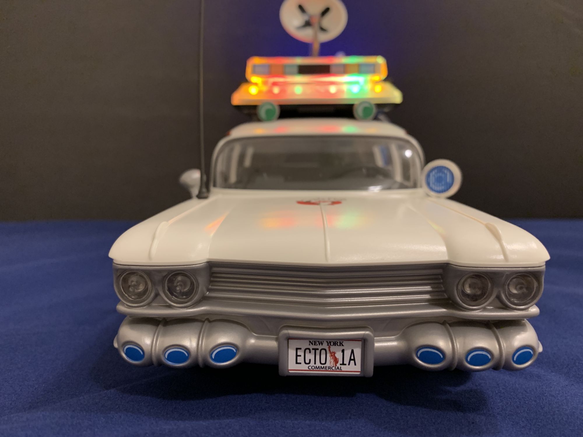 We are here for the car though, and boy is it awesome once you are done building it. Like the previous version, the top lifts off and inside are seats for all four Ghostbusters, along with a place to put the proton packs and such. I do wish the back cab was a little bigger to hold all of their attachments a little better, but thats ok. The top of the car features lights and the siren noise, easily activated by a button push. Three triple-a batteries are needed so keep that in mind. The radar dish on top rotates, and even the signs on either side are reflective and change as you pass them.