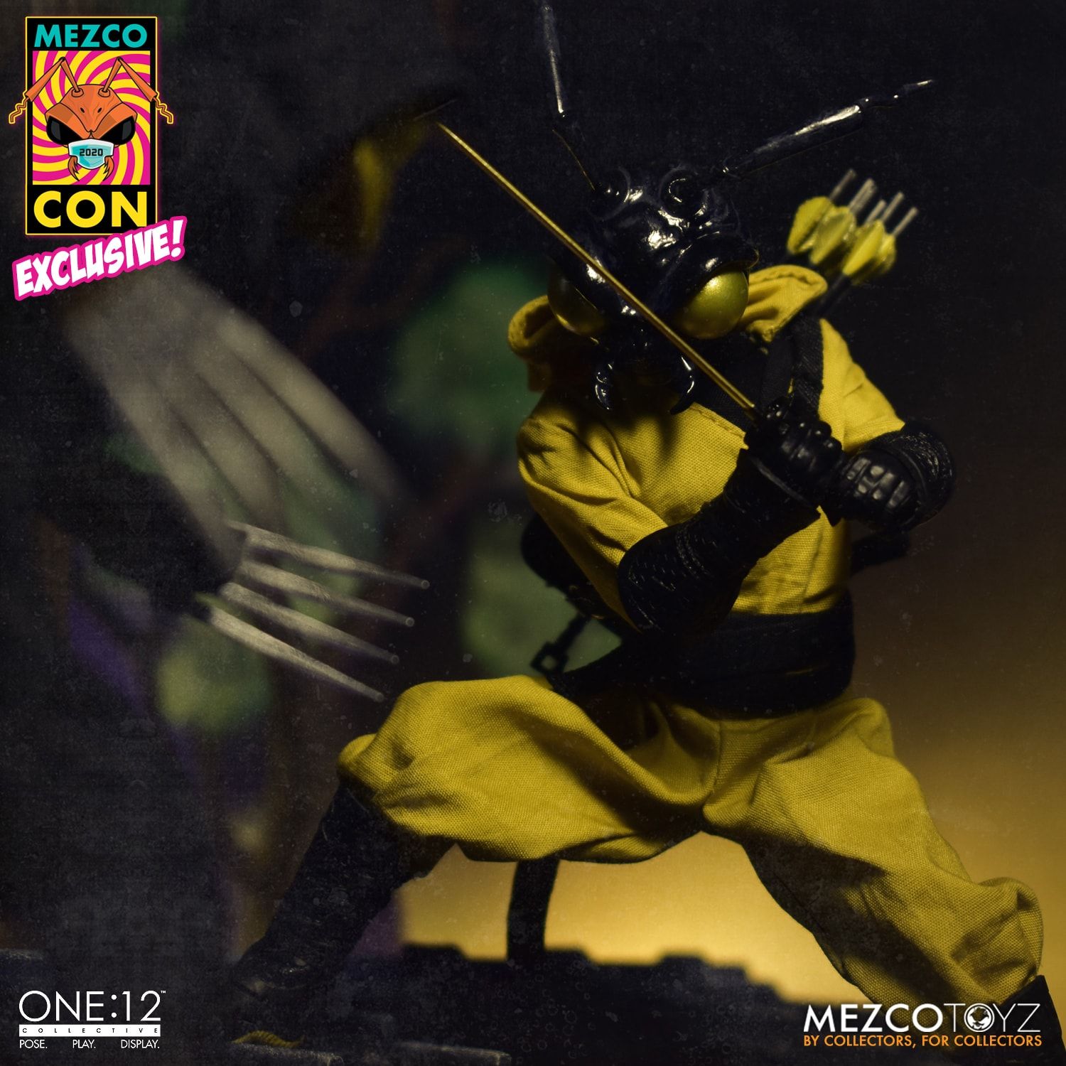 "The highflying warrior wears a shinobi shozoku with forearm guards, a waist belt, shin guards, and tabi boots. The Golden Dragon's greatest champion is equipped with a ninja-smoke plume FX that masks his next move, making Gomez the master of stealth. Small but mighty, Grub shows no mercy. The toddler clone of Gomez wears a matching outfit & comes with a sword of his own that he can hold."
