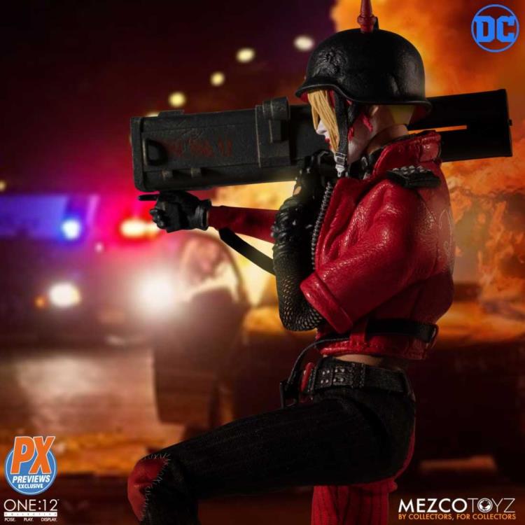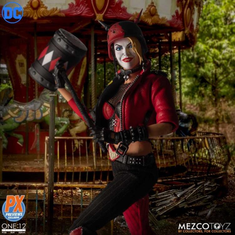 From Mezco Toyz. A PX Exclusive! Play for keeps with the poster girl for chaos, Harley Quinn! This One:12 Collective: Playing for Keeps Edition PX Exclusive Harley Quinn features an original punk spin on her classic black and red outfit! Rocking a shaved head, spiked helmet, and incredibly detailed biker jacket and boots, this Harley is ready to shred with some heavy artillery!