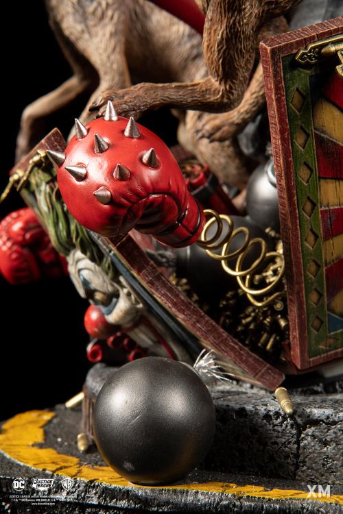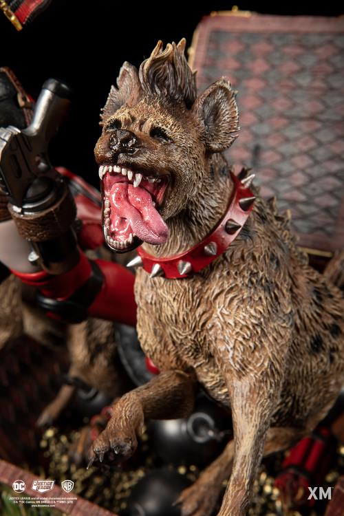 Harley Quinn has had a big fan base ever since her first appearance in Batman the Animated series. Her popularity was so big that they introduced her into the comic world with Batman Adventures #12. The love for her character has not died and we finally got to see her on the big screen in Suicide Squad portrayed by Margot Robbie. XM Studios Premium Collectibles has announced that they will be launching two new statues of Harley Quinn. Both statues are roughly the same as it's a Version A and B with A being a more reasonably priced version. The statue is beautifully crafted with Harley Quinn launching out of a jack in the box. She has a mallet in hand and a happy expression on her face. Each statue is hand-painted to perfection so this will be a limited edition statue. Version B of the statue includes another Harley Quinn's pet hyenas, Bud and Lou. This addition does add a new dynamic and feel to the statue and I love it. The little extras and all the details in these statues are quite amazing. From the exploding box to all of the gadgets flying out it and even to Harley Quinn. XM Studios defiantly put some love into this statue and it shows. These are the statues that change the game out there for the rest.