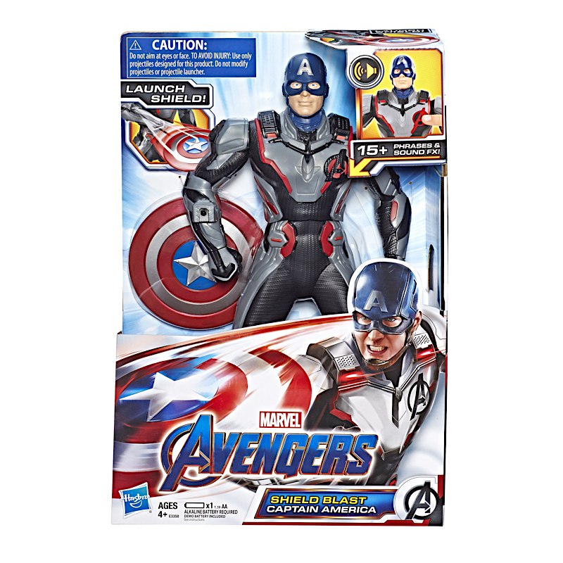 This 14-inch-scale SHIELD BLAST CAPTAIN AMERICA action figure features 15+ sound effects and phrases from the AVENGERS: ENDGAME movie, part of the MARVEL CINEMATIC UNIVERSE. Fans and kids can activate the shield blast feature and imagine the star-spangled Super Hero battling for the future of the universe alongside the other AVENGERS. Includes figure and accessory. Requires 1 1.5V AA batteries, included. Available at most major retailers.