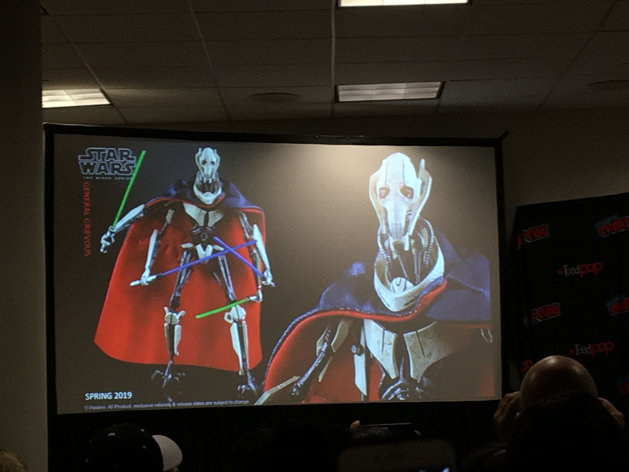 The panelists discussed that "we're seeing a lot more Prequel love" followed by claims that they "are working on offerings from those and will be revealing some between now and the end of the year, but not today." The next reveal for the Black Series was one that "is requested more than anything else," General Grievous in Spring 2019. He will be 7", with a cape that has pockets that you can put Lightsaber hilts in. Arms can be removed so that the figure will be displayed with either 2 or 4 arms. He is a new scale with a new price point. This is why he was not done before now, he was too big for the existing scale offerings.