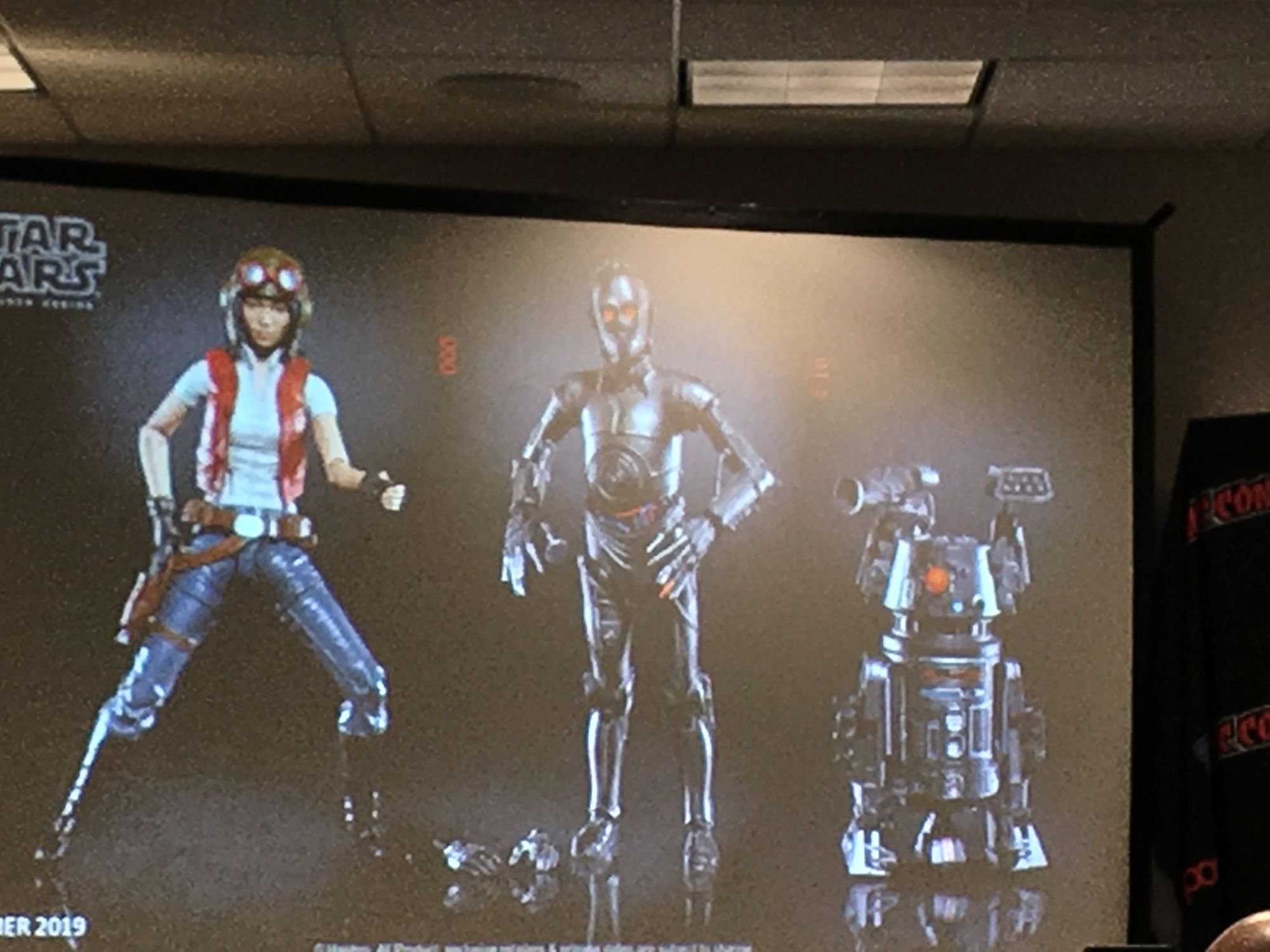 Doctor Aphra is being revealed today as part of Black Series. She is from the comics and while the character "is only a few years old she has gained a huge following." Her Helmet and vest are removable. Triple Zero and BT-1 are also being released. These are Aphra's assassin droids. All three figures are expected to be released Summer 2019.