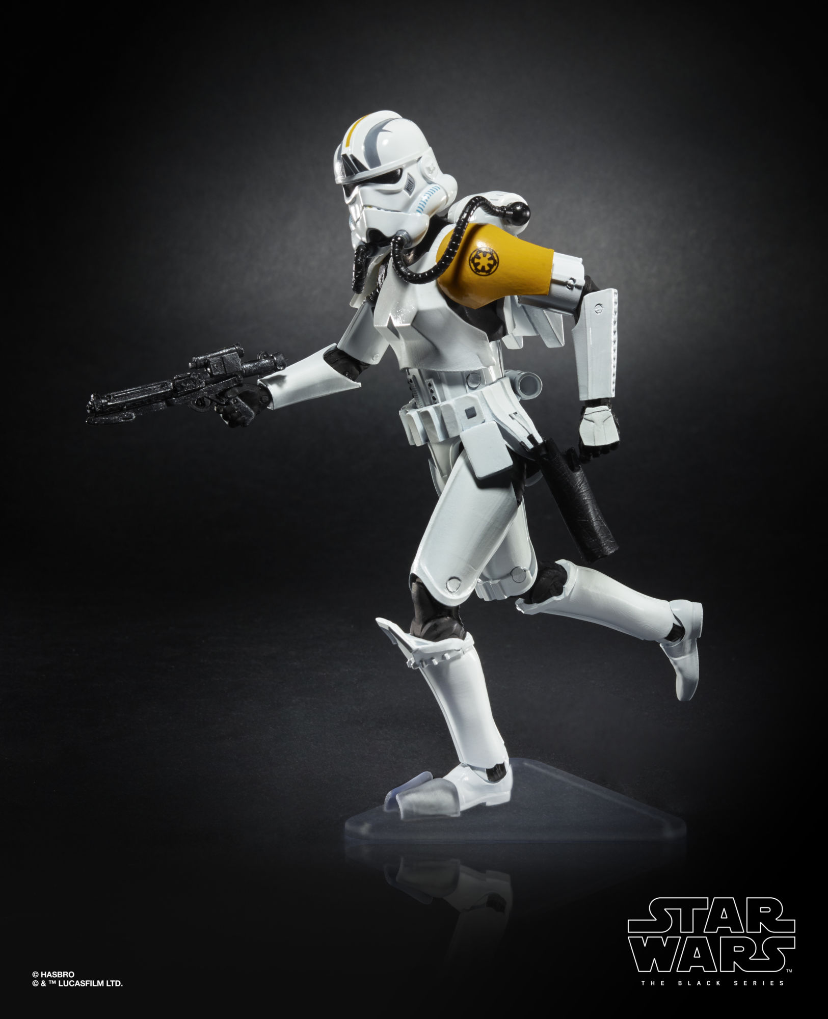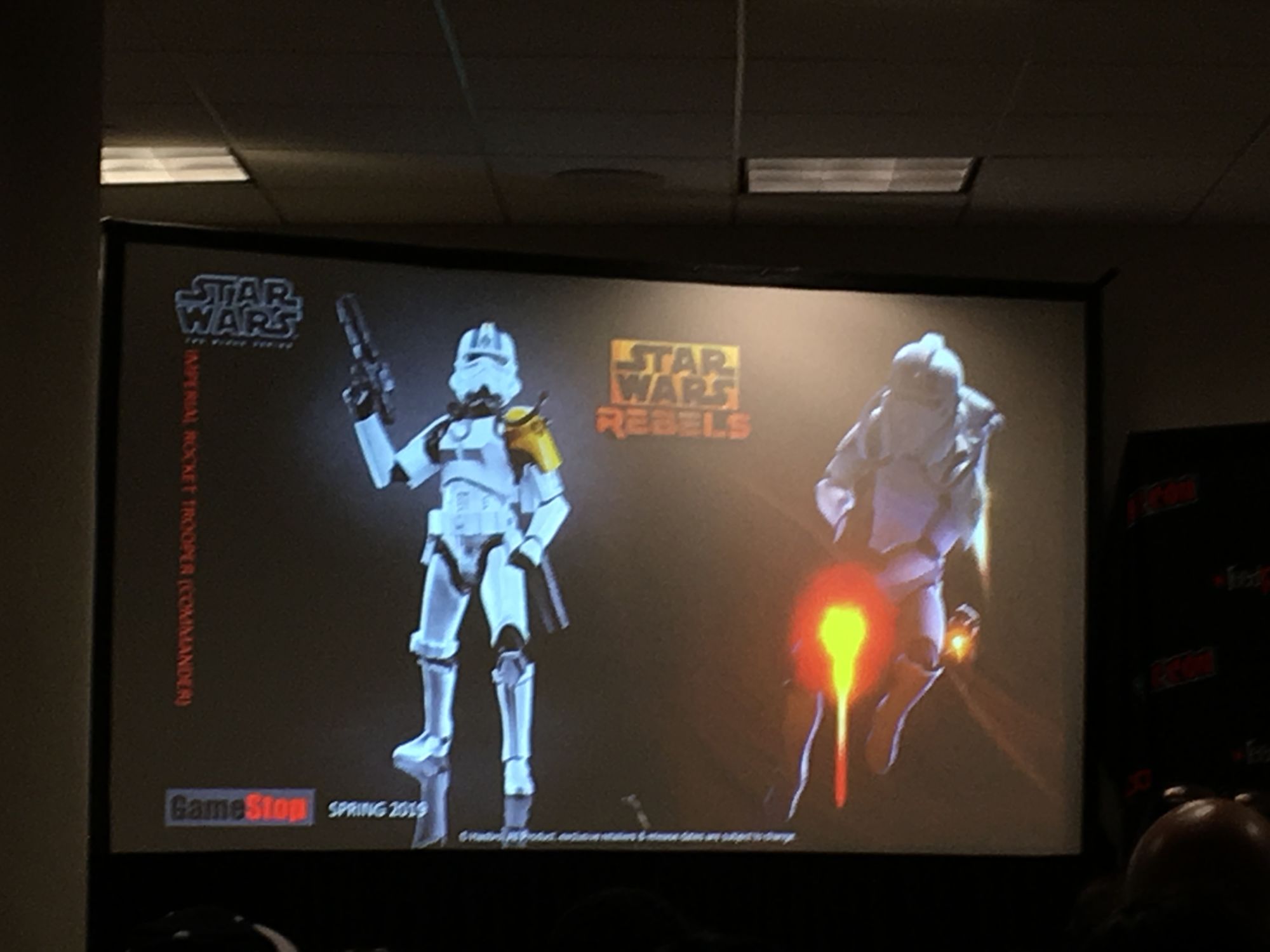 The next figure shown was, as seen in Rebels and Battlefront II, the Imperial Rocket Trooper (Commander) as a Black Series figure. This will be a GameStop exclusive. He will have a new, triangular stand, with "no pegs and more of a 'slipper'." Often these exclusive figures are used to work out some technical issues and try new things.