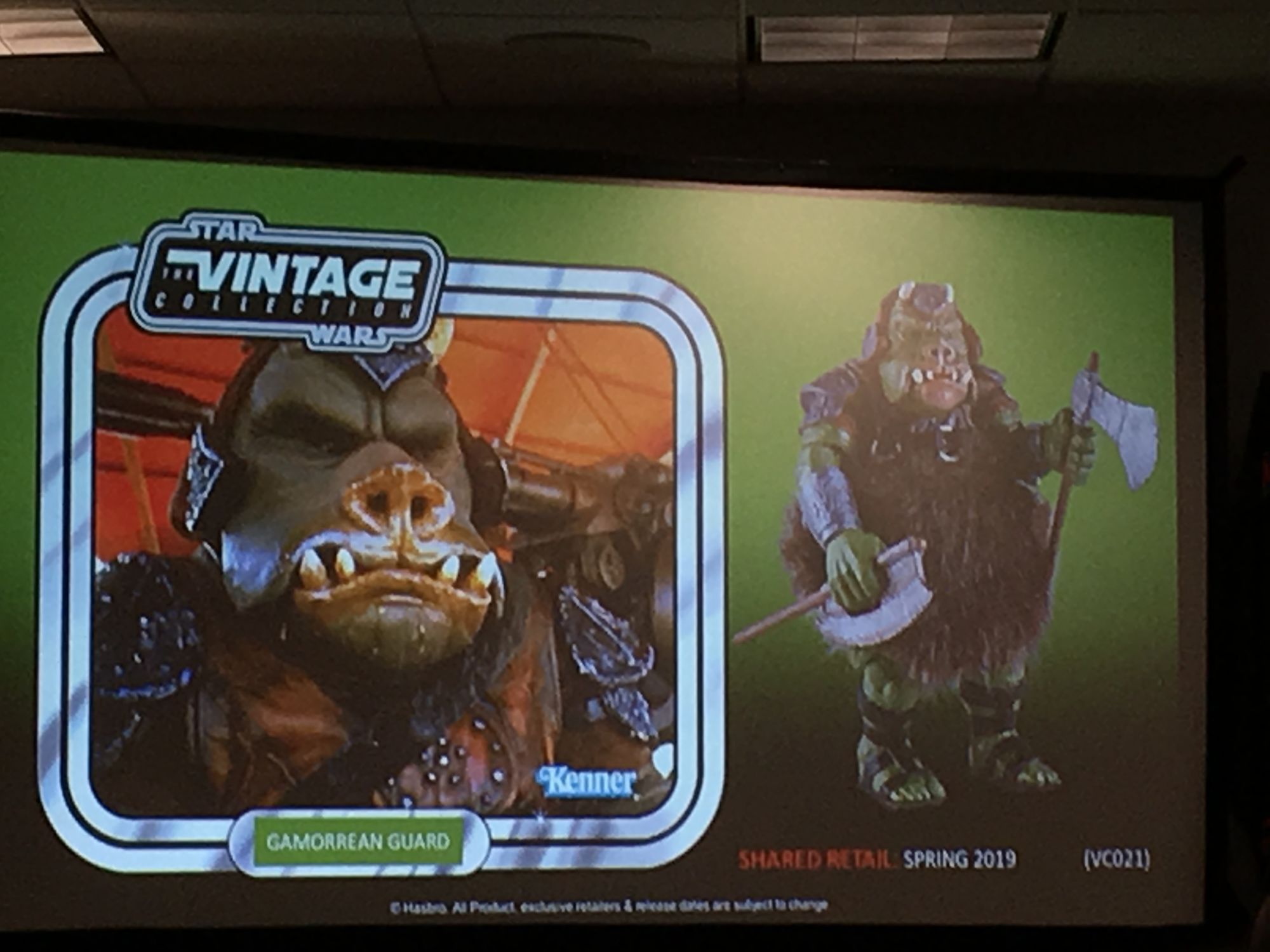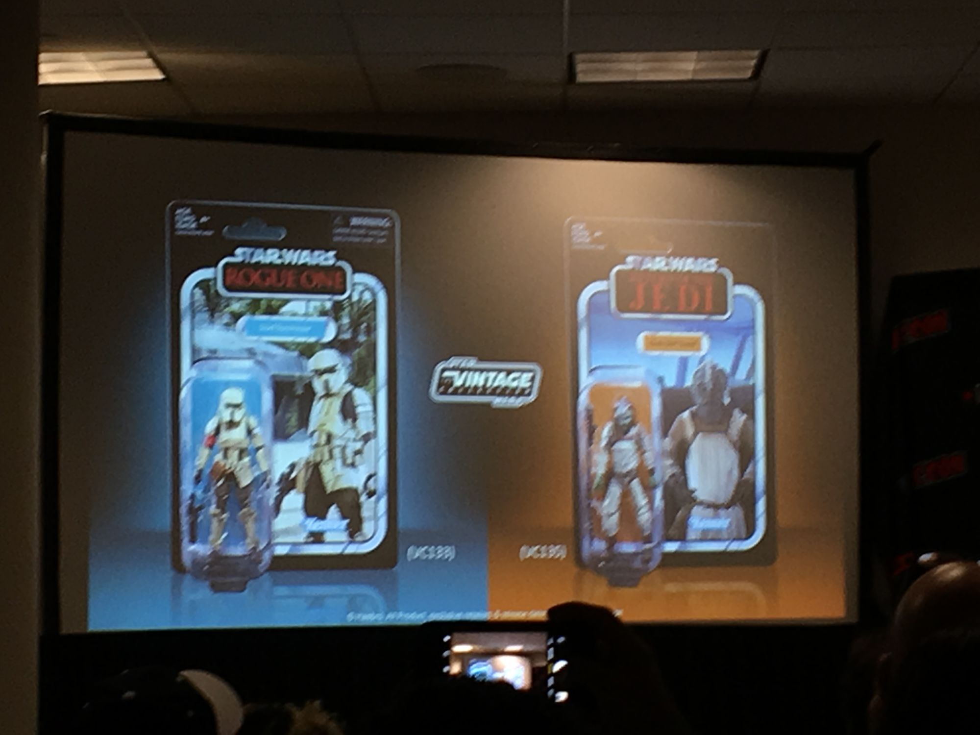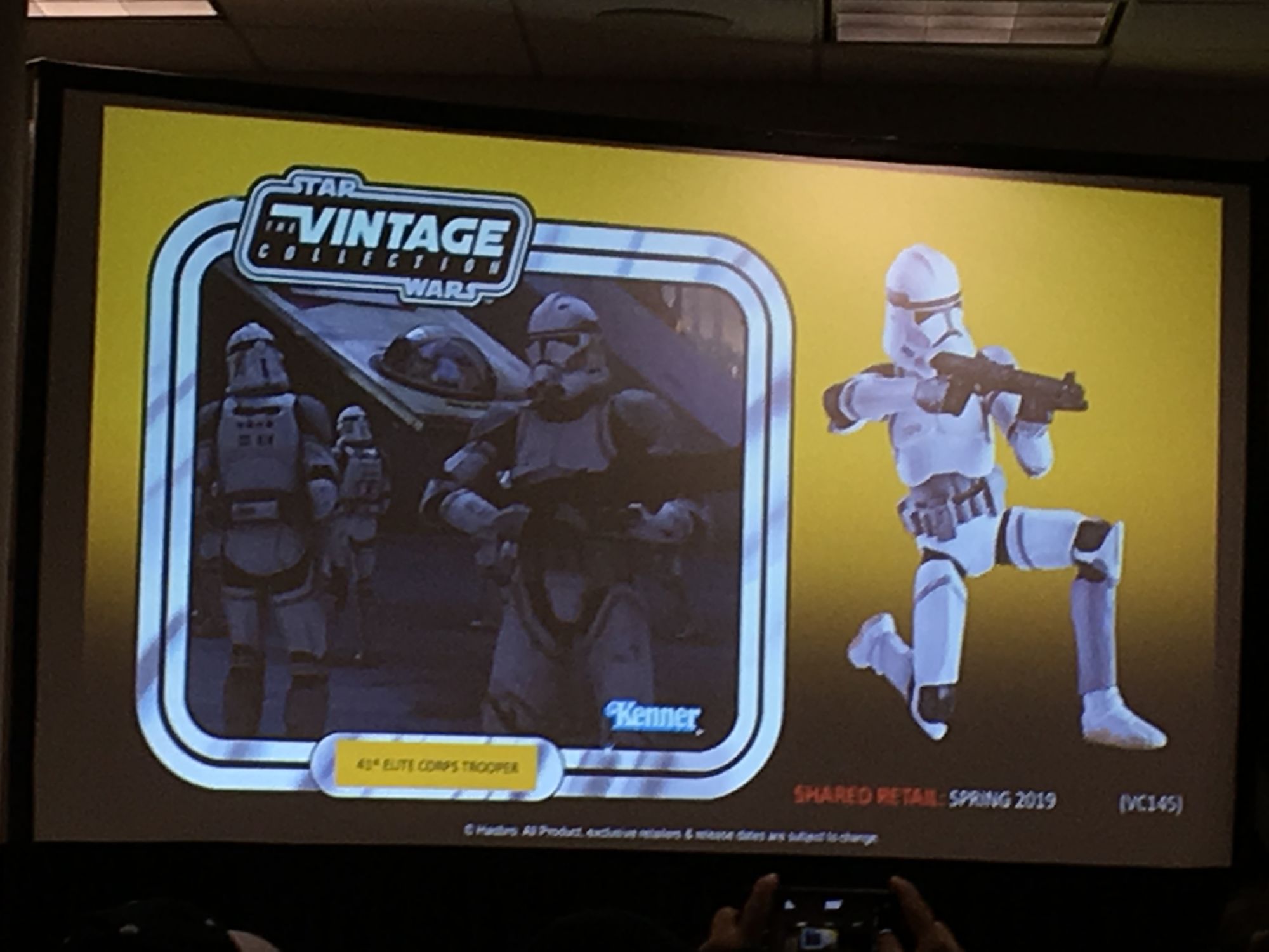 Star Wars: The Vintage Collection will have a Han Solo in Stormtrooper disguise, and 41st Elite Corps Trooper (Clone Trooper), to be released in Spring 2019. The Elite Trooper will have "properly colored gloves and belt." Retro-packaging Scarif Stormtrooper from 'Rogue One' was shown. This is meant to show "what if this came out in 1983? Before Photoshop." These are based very heavily on the classic Kenner line.
