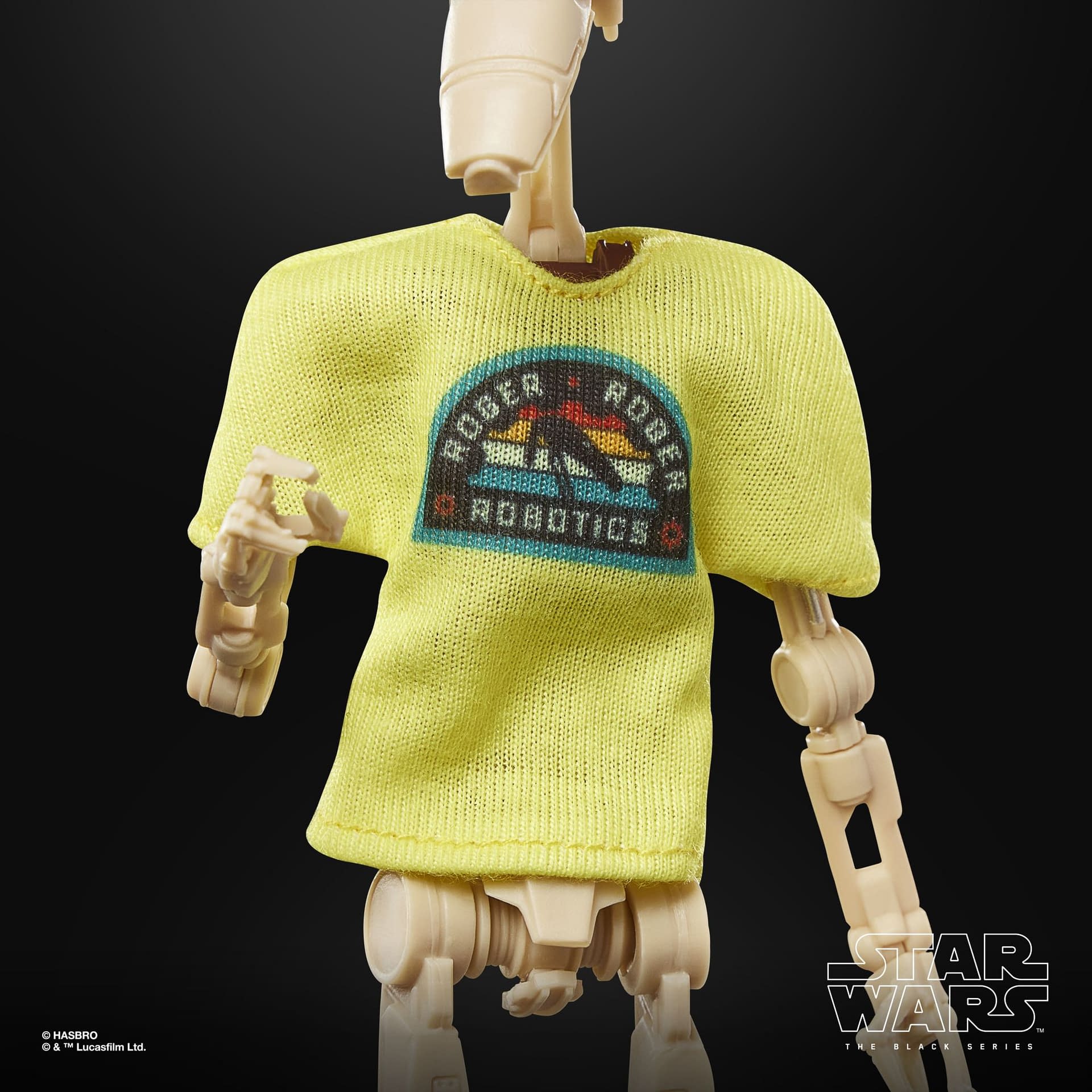 "This 6-inch-scale figure features premium design and deco, multiple articulation points, and a soft goods "Roger Roger Robotics" t-shirt. Pose out your figure with the included blaster accessory and the "target practice" poster of the legendary Jedi Anakin Skywalker. Window box packaging features the classic black and yellow color scheme and a "5.04" collector number."