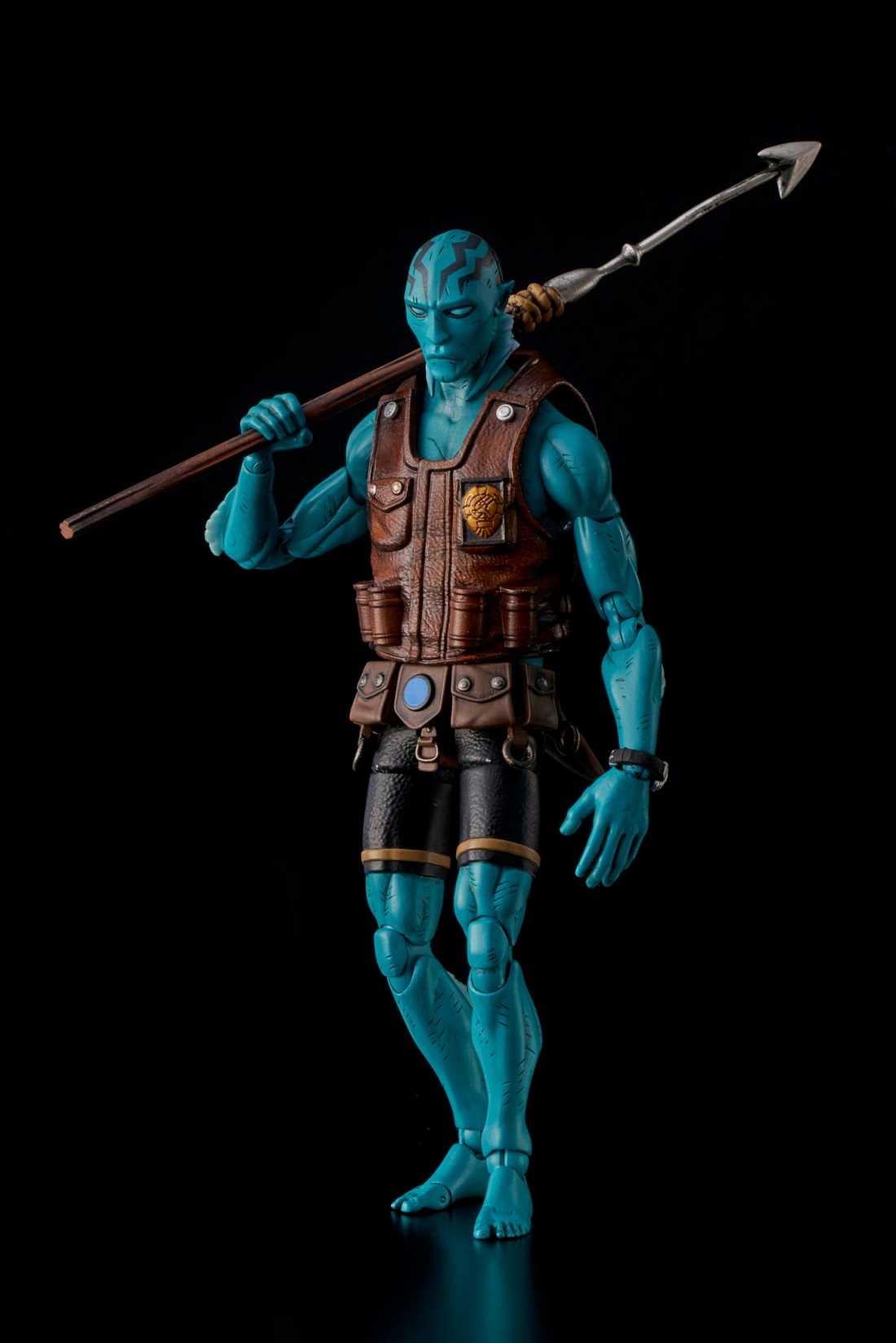 From 1000toys. A PREVIEWS Exclusive! 1000toys is proud to present the 1/12-scale fully articulated Abe Sapien action figure from Mike Mignola's comic series! Developed to capture the touch of Mignola seen in the original art without giving up anything in articulation, this is the Abe Sapien action figure that fans have been waiting for! Along with an assortment of interchangeable hand, spear gun, knife and pistol, this PREVIEWS exclusive Abe Sapien figure includes Abe's vest with the BPRD logo emblazoned across the back!