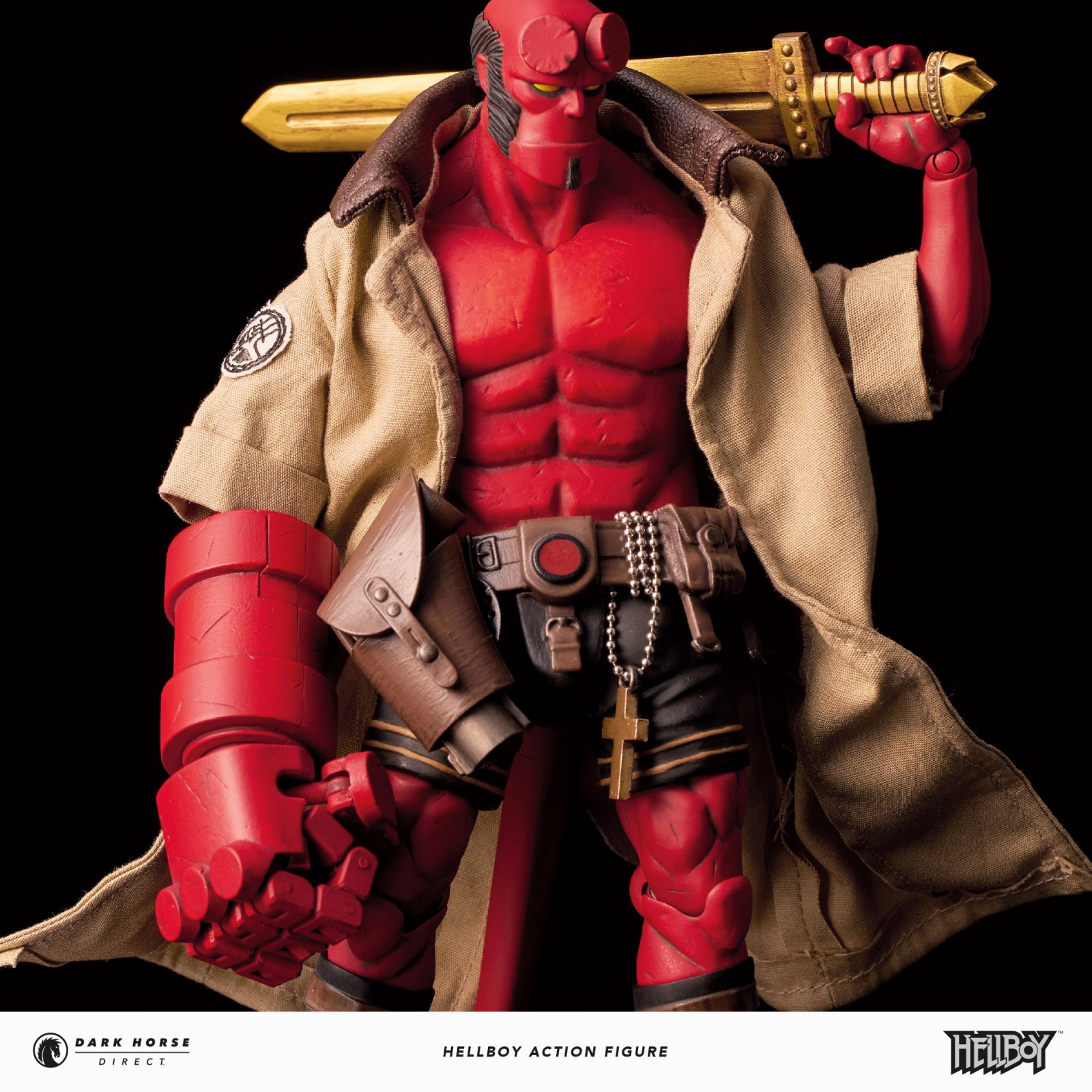 If you love Hellboy as much as we do, you NEED this in your life. Dark Horse Direct, alongside creator Mike Mignola and 1000toys, are proud to present the fully articulated, 1/12th scale Hellboy action figure of your dreams. Made from PVC and standing at 7.5" tall, this stellar Hellboy figure comes with interchangeable Beast of the Apocalypse head, closed fist hand, open hands for holding other accessories, separate gun, Excalibur sword, and removable cloth jacket.