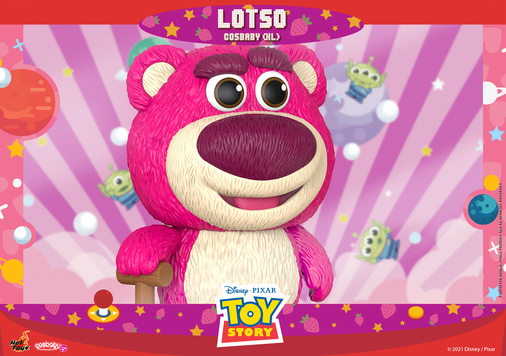 "Oooohhhh! Rescue the loveable Alien from the clutches of The Claw! The 34.5cm tall sized-up Alien Cosbaby (XL) in classic blue space outfit is out-of-this-world cute; while the special Alien (Iridescent Color Version) Cosbaby (S) is bringing an alternative choice of collection for fans of little alien fans. Save up lots of love for the 30cm tall Lotso Cosbaby (XL), because the teddy really needs it! Bring home today the adorable Cosbaby from Toy Story!"