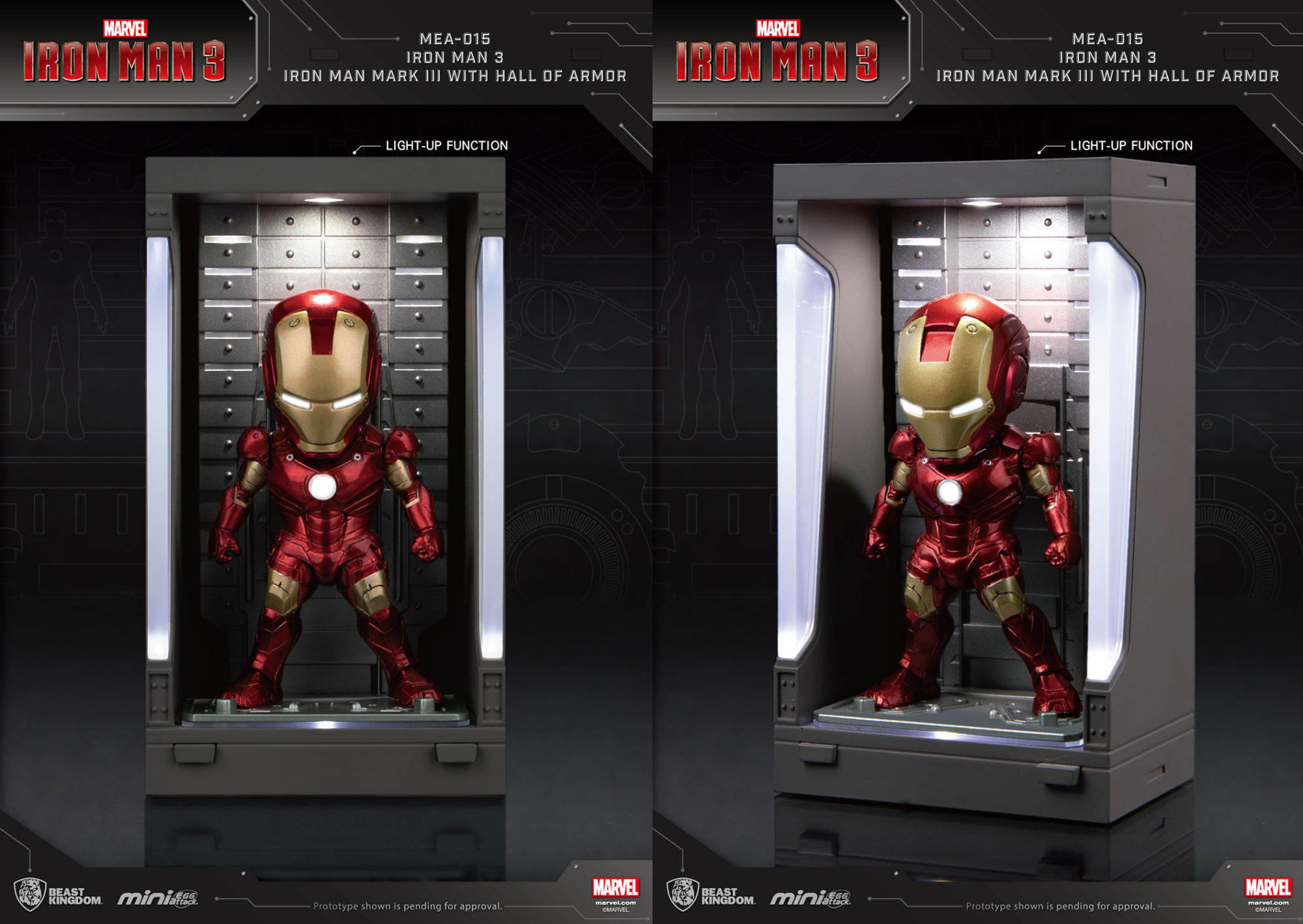 From Beast Kingdom. A Previews Exclusive! Bringing together seven generations of Iron Man Suits, the Hall of Armor is the perfect way to show your love of all things Iron Man! Beast Kingdom's Mini Egg Attack series takes the classic Iron Man suit designs and shrinks them to a convenient 3-inch height so you can take your desk collection to the next level! Both suit and storage units feature light up functions, so you can easily admire the paint and design work of Iron Man Suits Mark 1 to 7. Collect them all and showcase all the ways you can save the universe!