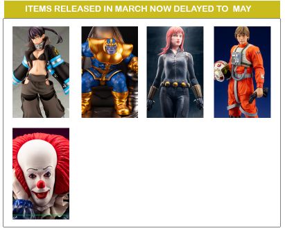 The delays continue as nationwide cancellations, reschedules, and suspensions plague the nation. This time the toy companies are starting to feel the pressure will new shipping delays. Kotobukiya recently announced a list of all the products that will be impacted by "unforeseen circumstances". Most of these delays are only pushing some statues back either 1 or 2 months from March to April or March to May. Let's hope the delays do not continue so collectors can continue to collect in a timely manner.