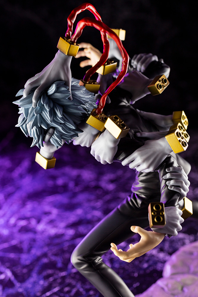 As Tomura crouches low at the ready, his pose captures the force of intimidation brought about by his presence. Pay close attention to the aura of madness resonating from the sculpt.