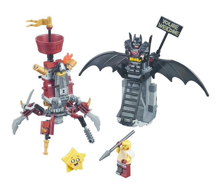 Builders can scuttle into action against Star with this action-packed Batman playset featuring the famous pirate MetalBeard in crabmech form, with a built-in LEGO MetalBeard minifigure head, opening treasure chest with MetalBeard's internal organ elements, flip-down crow's nest with a flag and posable legs, plus a Batman throne with an adjustable 'You're Welcome' sign. Includes 2 minifigures, a brick-built Star figure, and weapons and accessories.